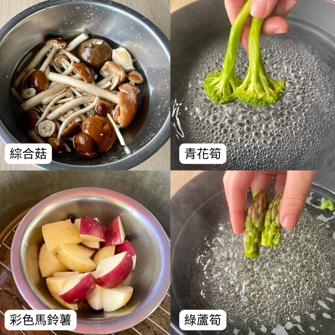 準備一鍋滾熱水,青花筍、綠蘆筍 ,需要汆燙。
