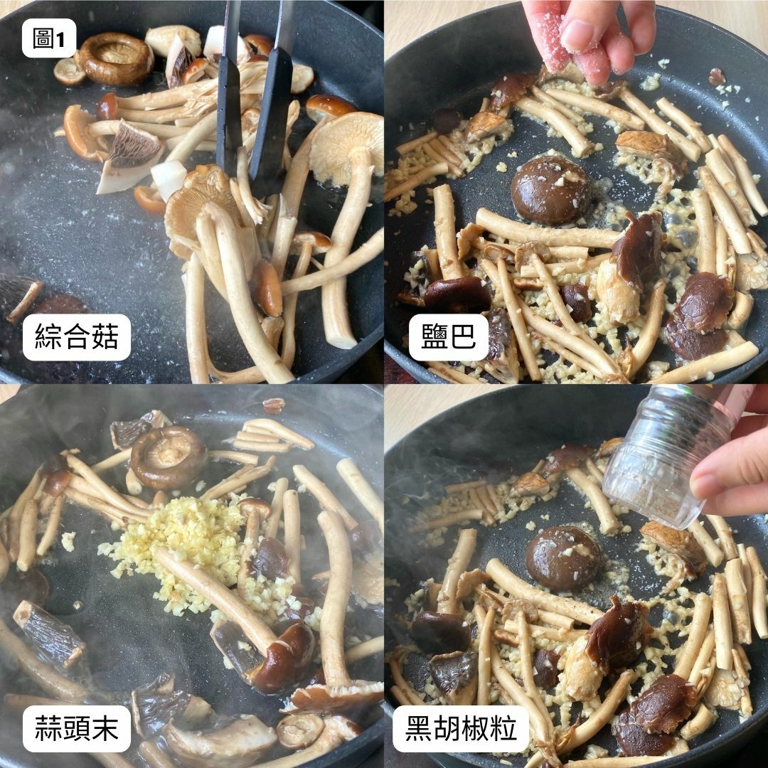 熱鍋後,綜合菇先炒,再加蒜頭末炒香,鹽巴、黑胡椒調味。