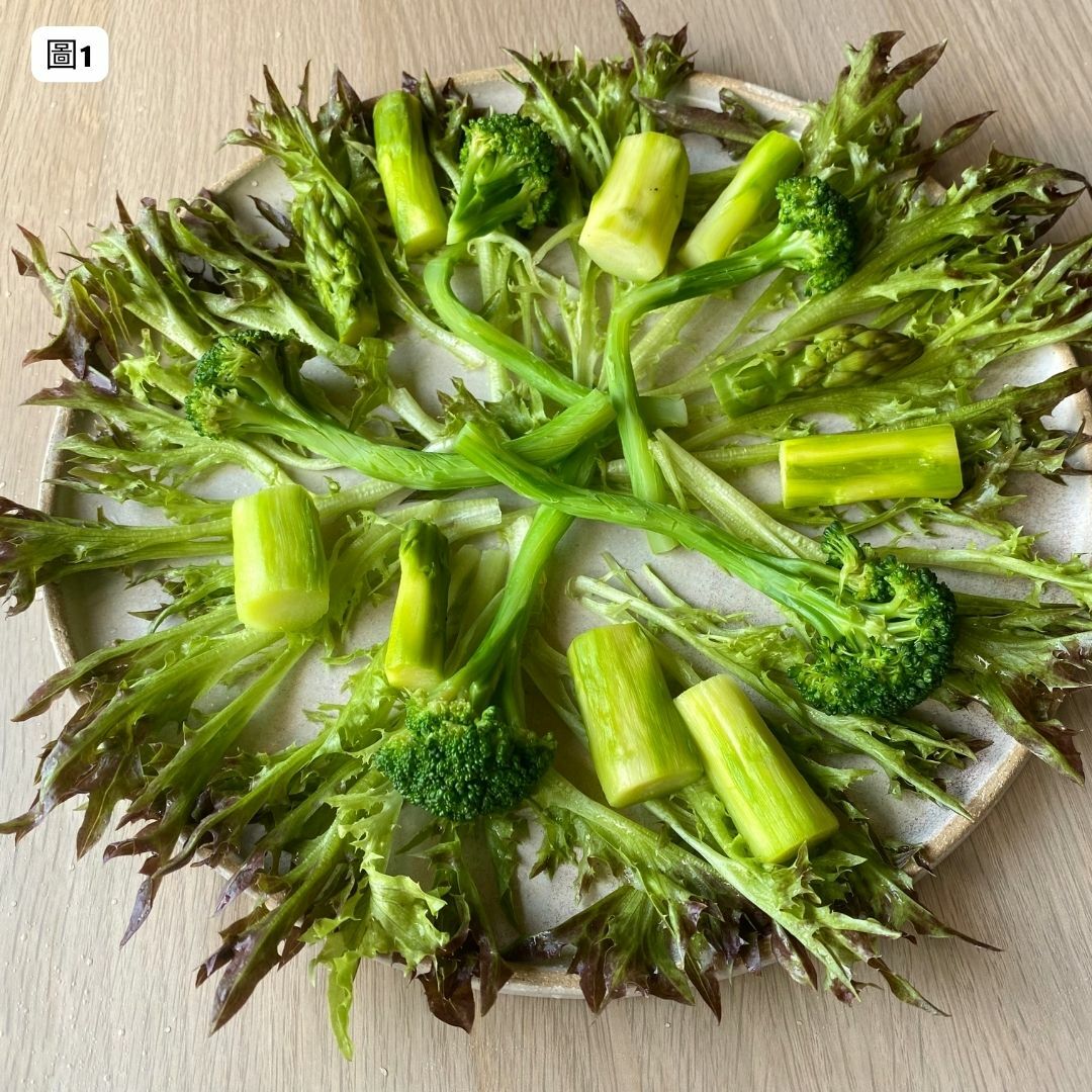 圖1. 將紅火焰生菜鋪在底層,把剛燙好的青花筍、綠蘆筍放涼後鋪上。