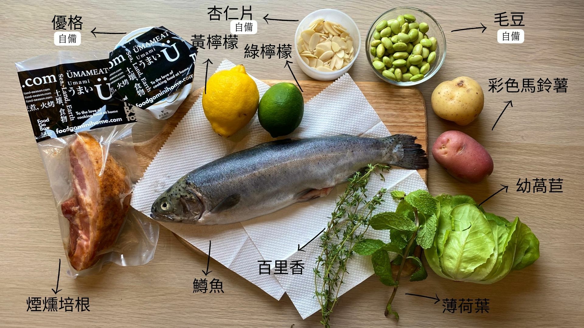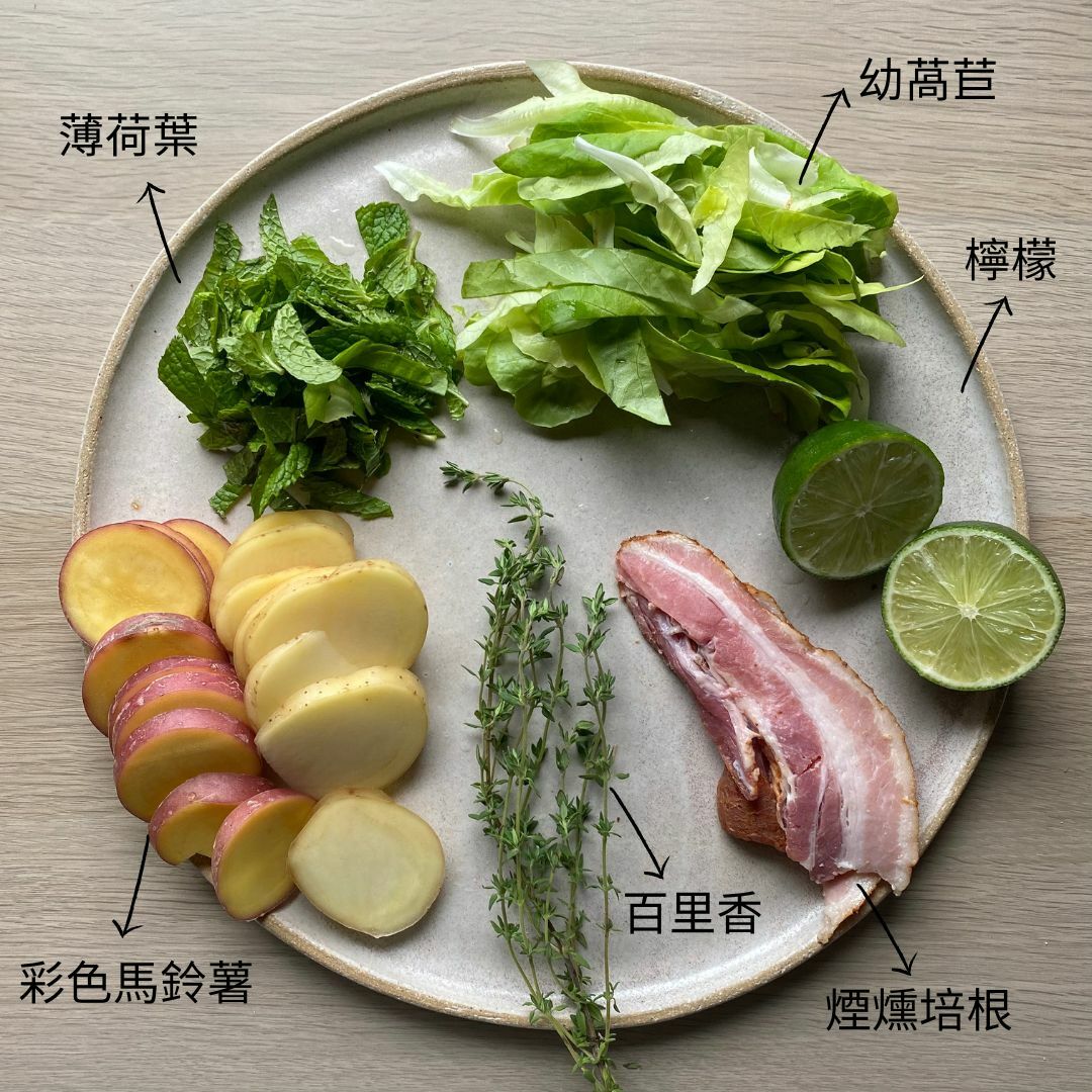 PARTS 鱒魚/彩色馬鈴薯/幼萵苣/薄荷葉/百里香/煙燻培根/黃檸檬/綠檸檬/芥末籽