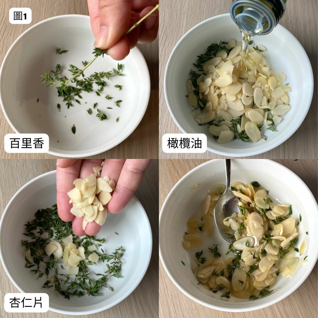 圖1. 準備一個碗,加入些許百里香、杏仁片和些許橄欖油,攪拌均勻。