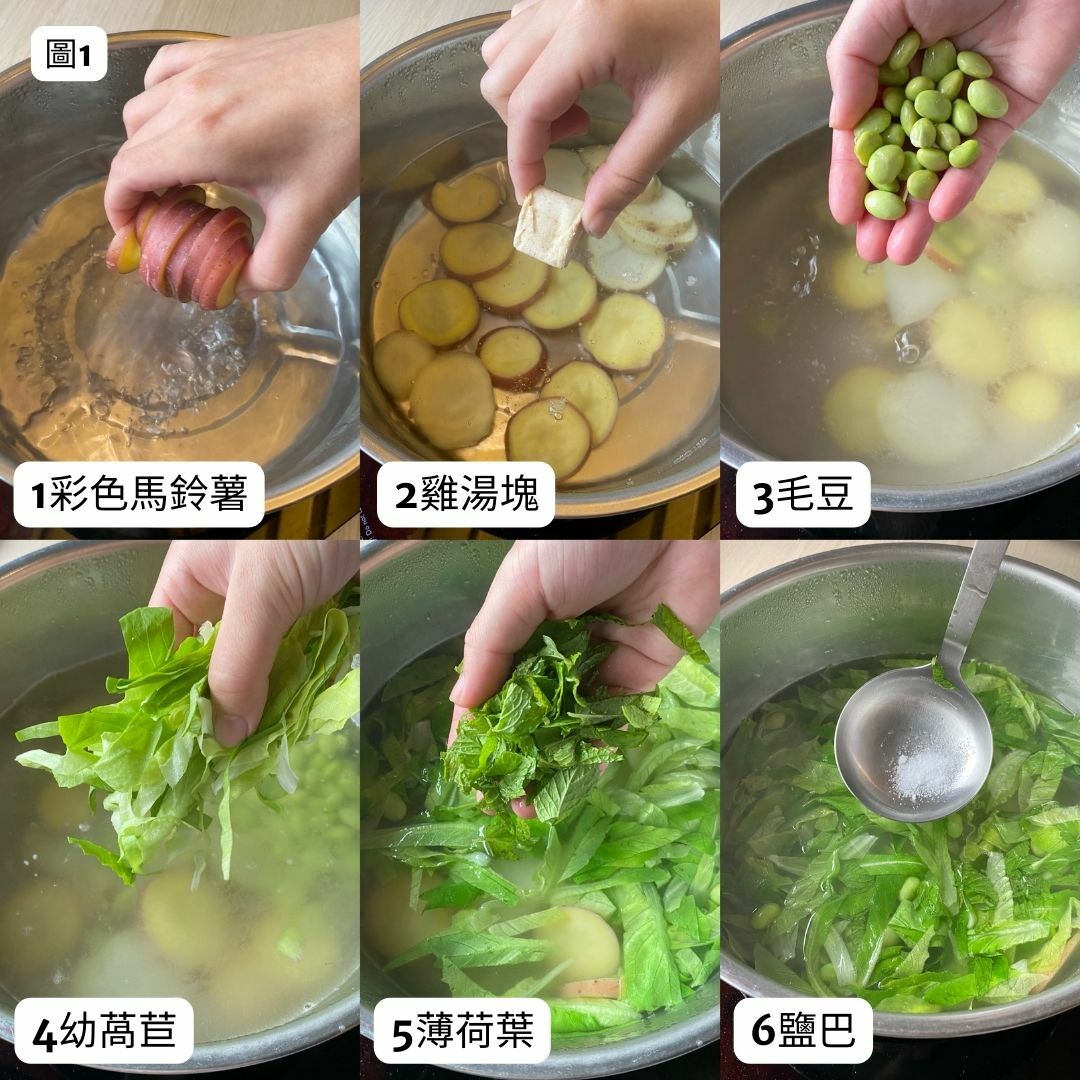 圖1. 準備一鍋滾水,將切片好的彩色馬鈴薯、雞湯塊煮滾,再放入毛豆,最後幼萵苣、薄荷葉再放進去,適量鹽巴調味即可。