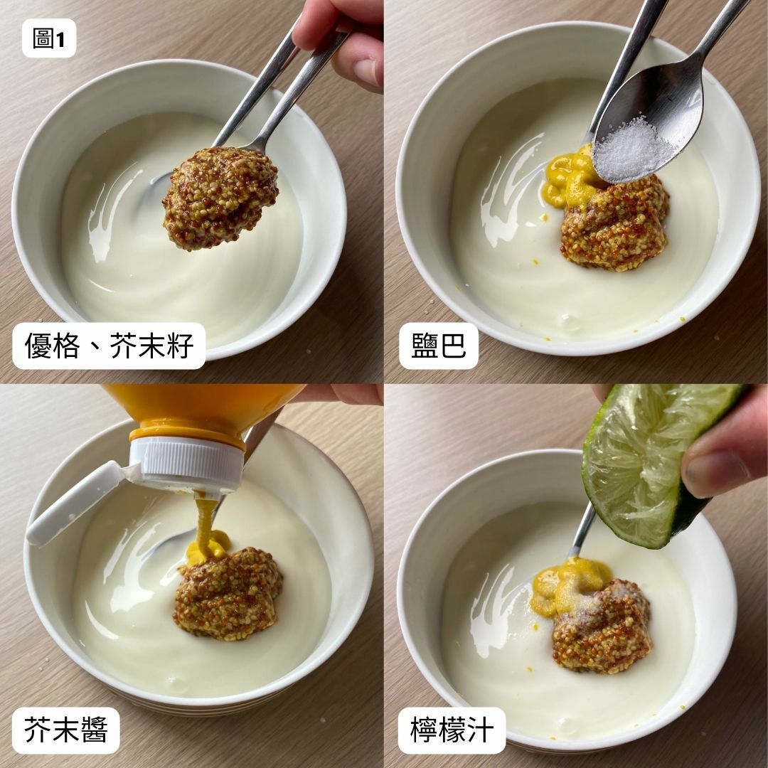 圖1. 選一個小碗,將2大匙優格、1小匙芥末籽、1小匙芥末醬、適量鹽巴、些許檸檬汁加在一起。