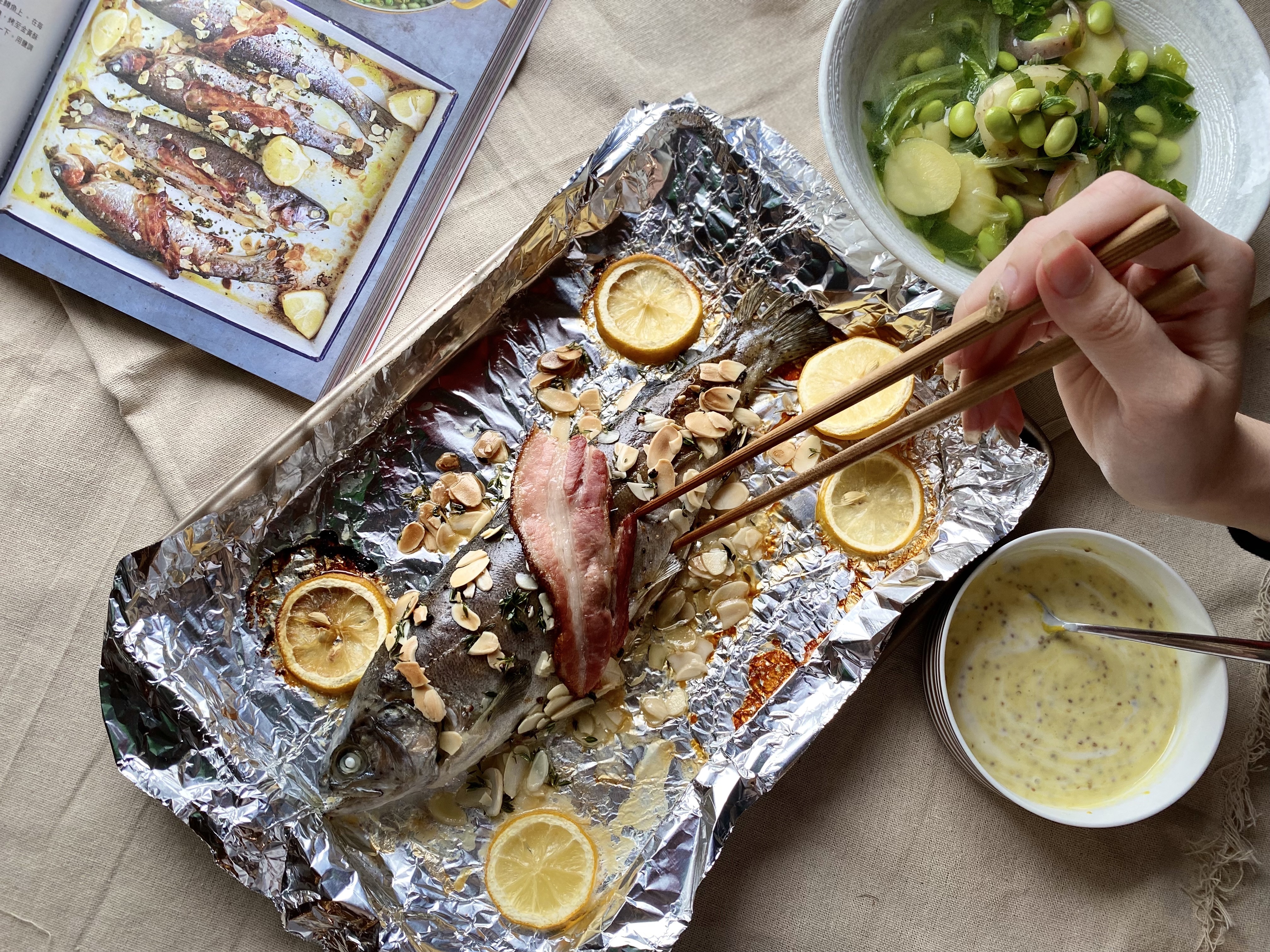 圖2. 烤盤鋪上鋁箔紙,將鱒魚放上,外層再淋上些許橄欖油。