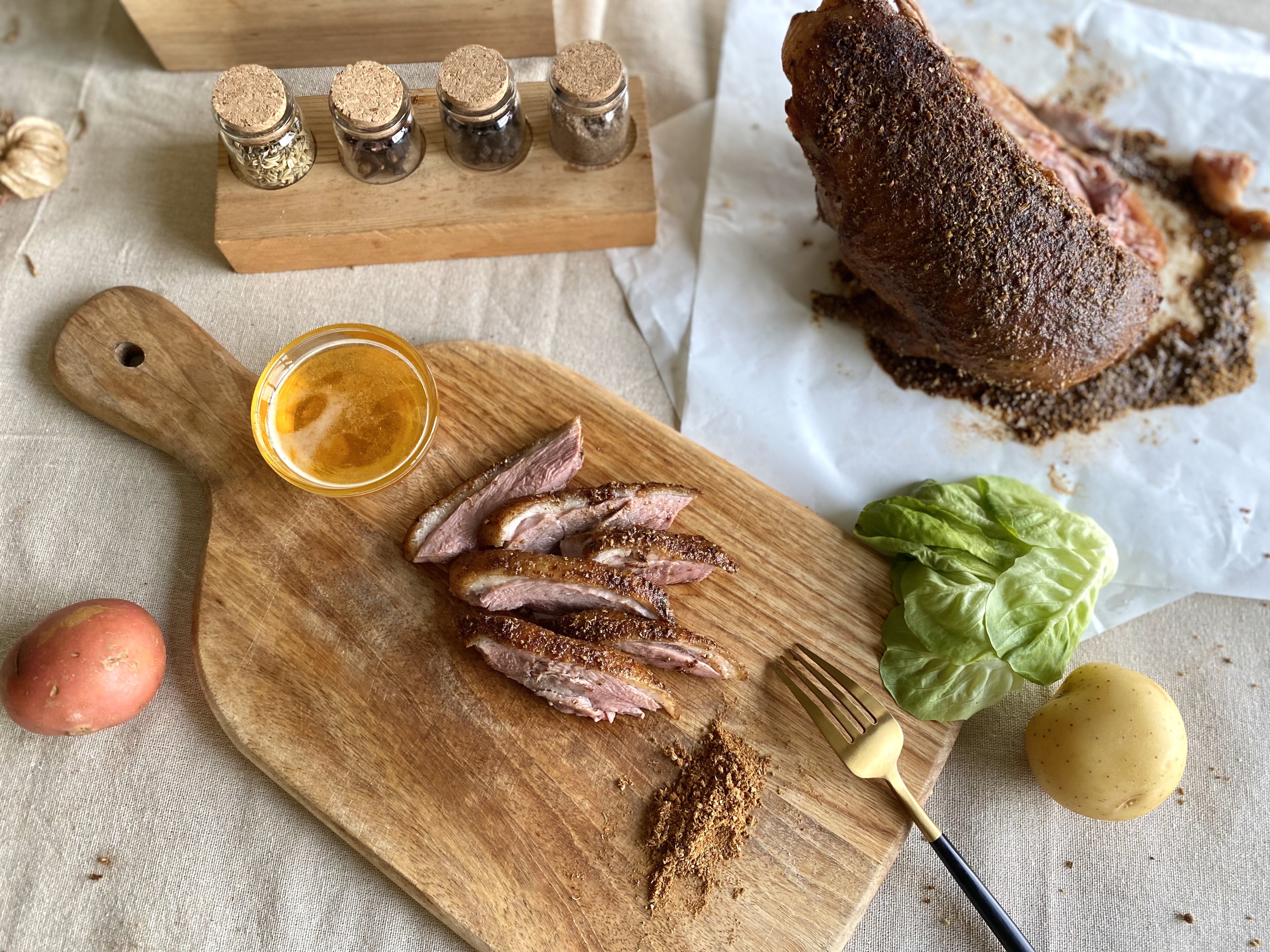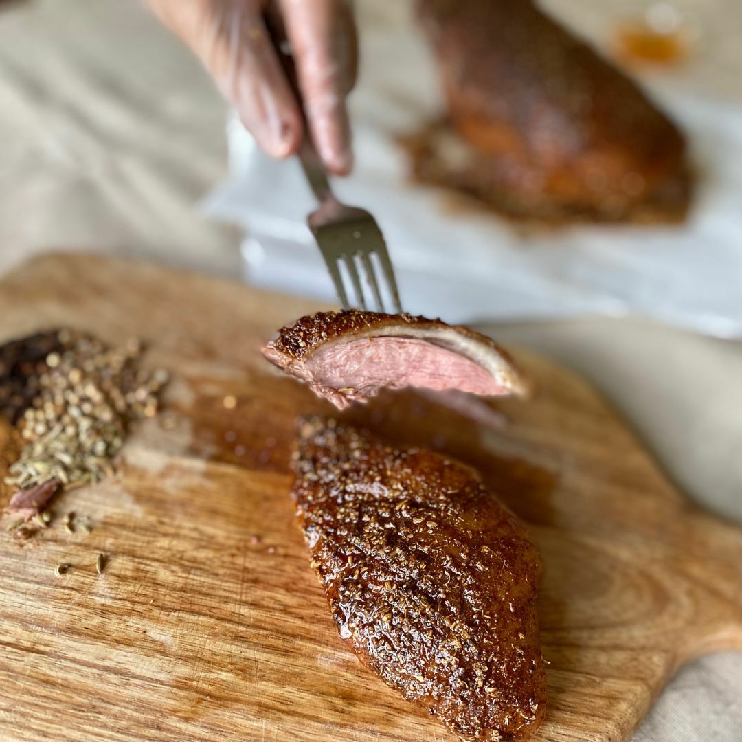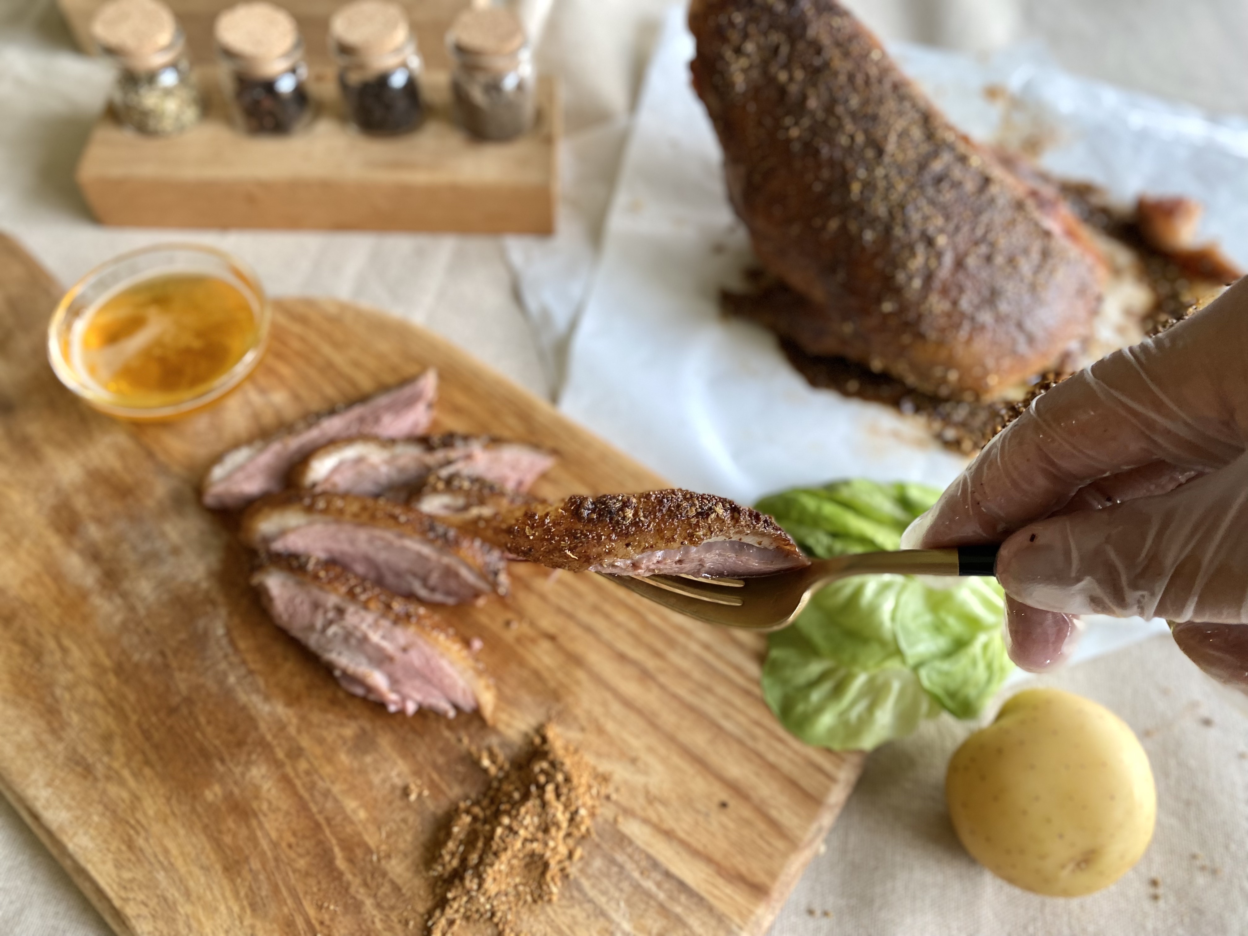 烹煮完的阿彼修斯鴨,粉紅色澤的肉質軟嫩和異國香料的皮脆帶有蜂蜜香甜,在味蕾上非常有層次感,這道料理非常適合在特殊的節慶裡為愛人下廚!
