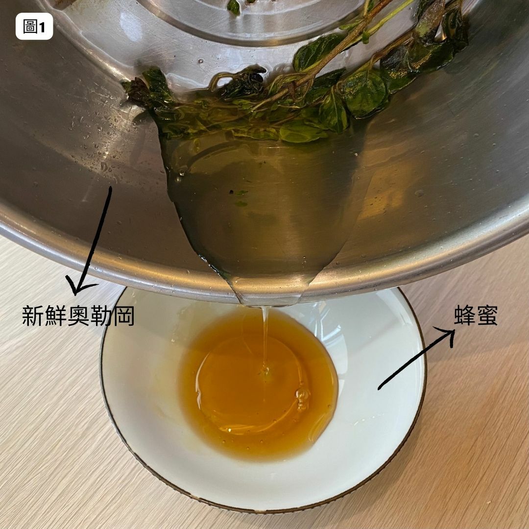 圖1、圖2、圖3. 半碗的橄欖油,熱油鍋,將新鮮奧勒岡放下去煮滾約3分鐘,放涼後,加入蜂蜜裡攪拌均勻,(新鮮奧勒岡油1:蜂蜜2)。
