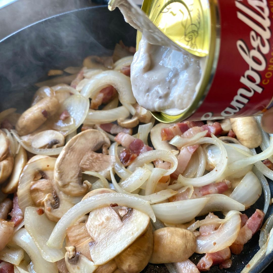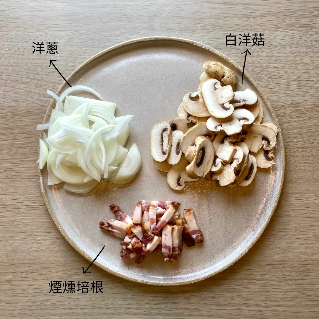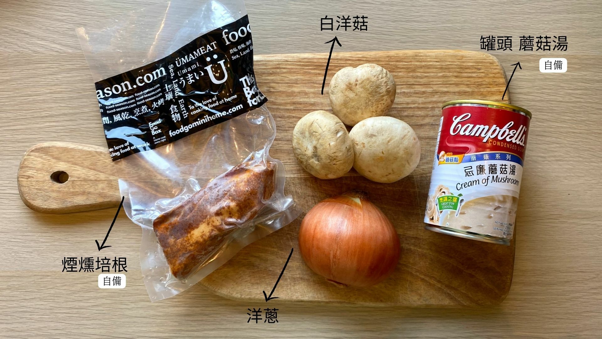 自備 煙燻培根、罐頭蘑菇湯、鹽巴、黑胡椒粒、橄欖油