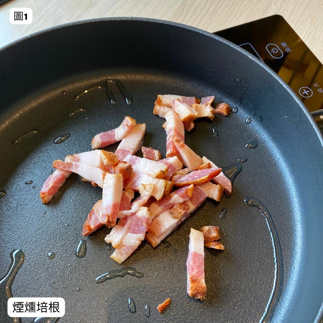 圖1、圖2、圖3. 1大匙橄欖油,熱油鍋,煙燻培根先爆香,依序放入洋蔥炒至金黃色再加入白洋菇炒上色。