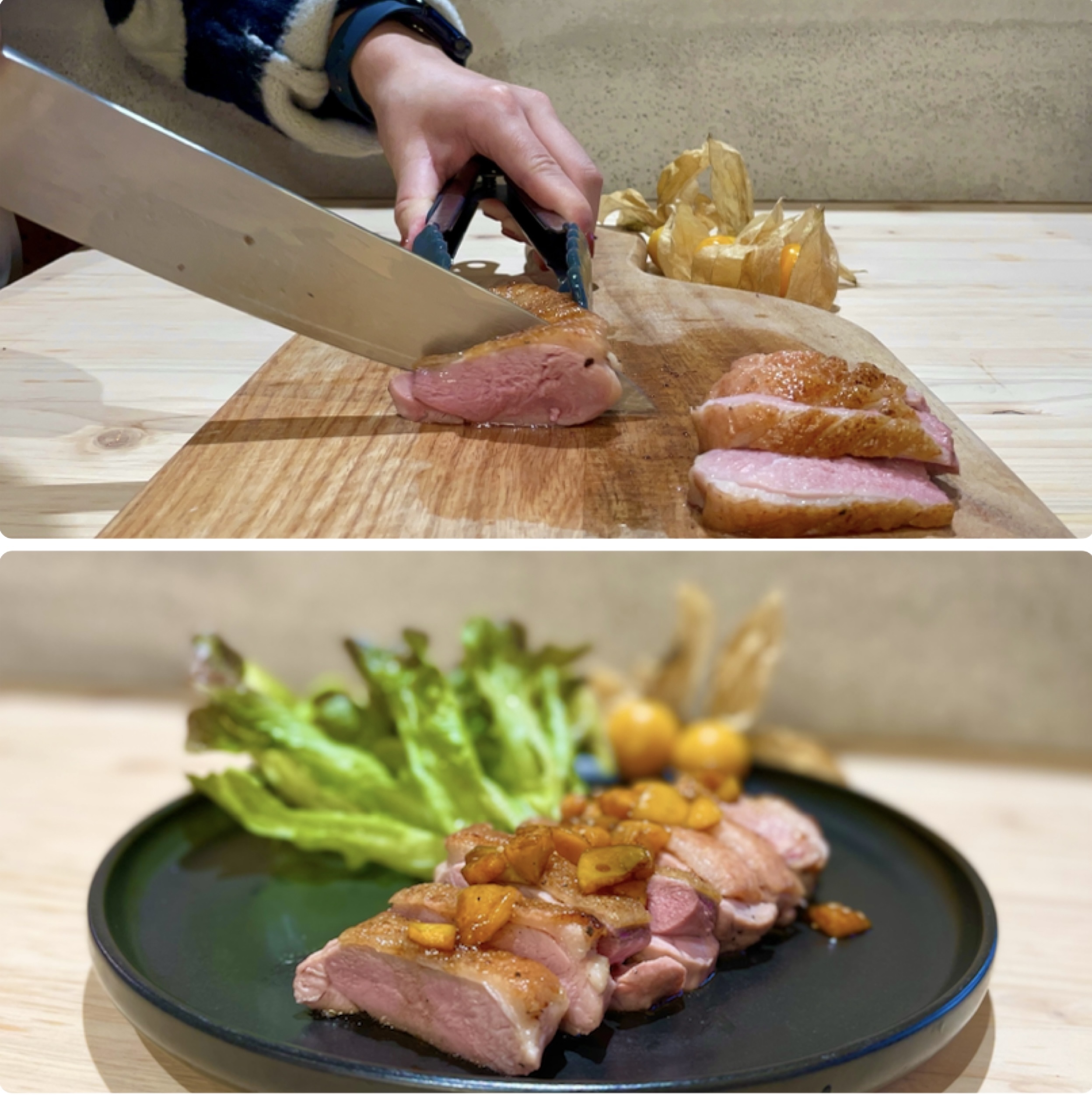 口訣一: 冷鍋不放油先煎鴨皮⑧分鐘 (記得先劃刀,讓鴨皮更酥脆)