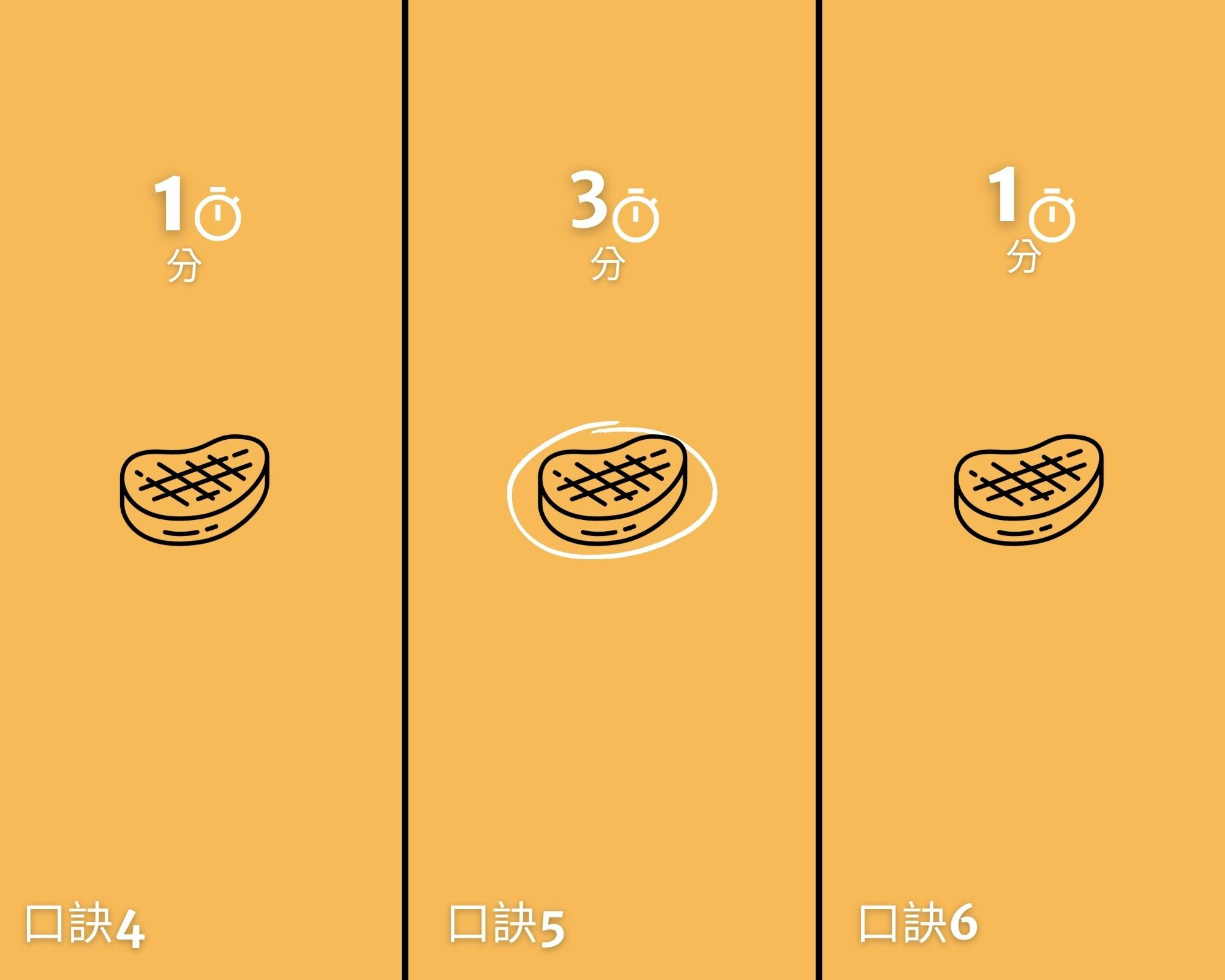 口訣二: 煎肉面①分鐘 ㊙(兩側面額外各煎15秒,封鎖肉汁)