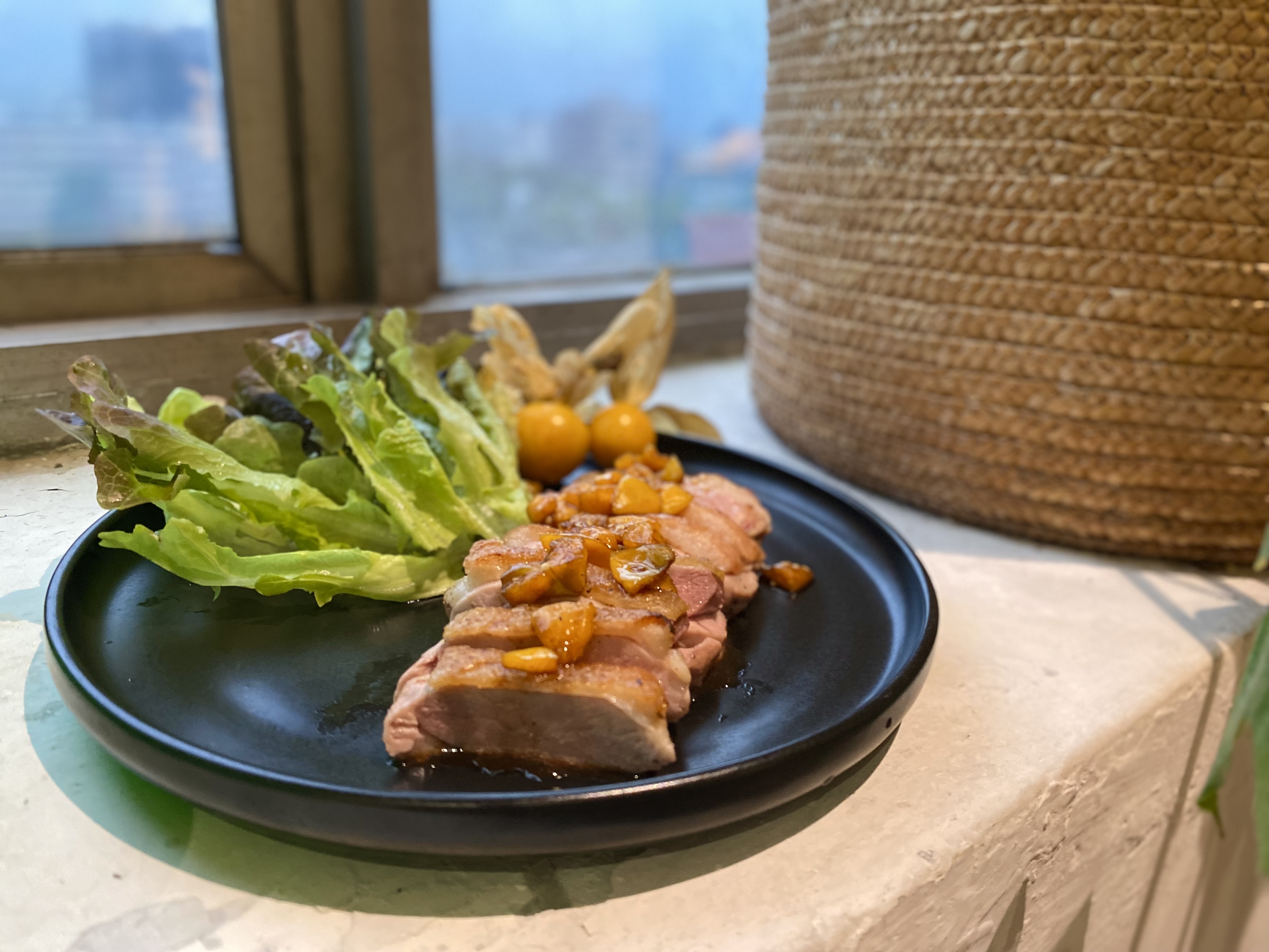 將多餘鴨油擦拭掉(可以拿來炒菜),加入一小塊奶油焦化後,回煎鴨皮①分鐘 (增加香氣)