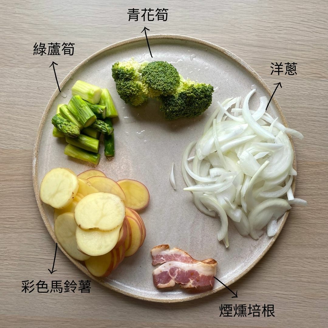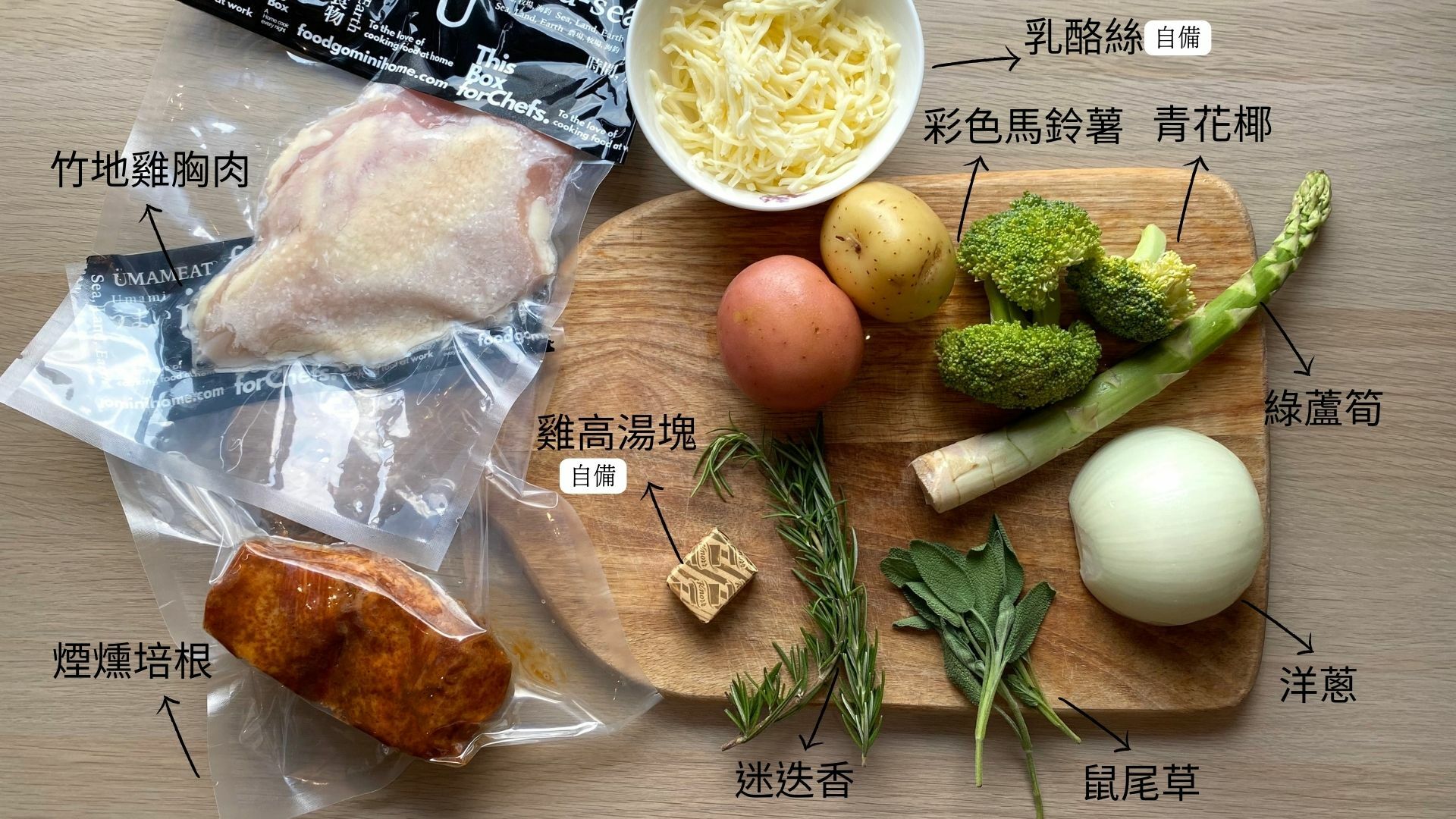 PARTS 竹地雞胸肉/彩色馬鈴薯/青花筍/綠蘆筍/洋蔥/煙燻培根/迷迭香/鼠尾草