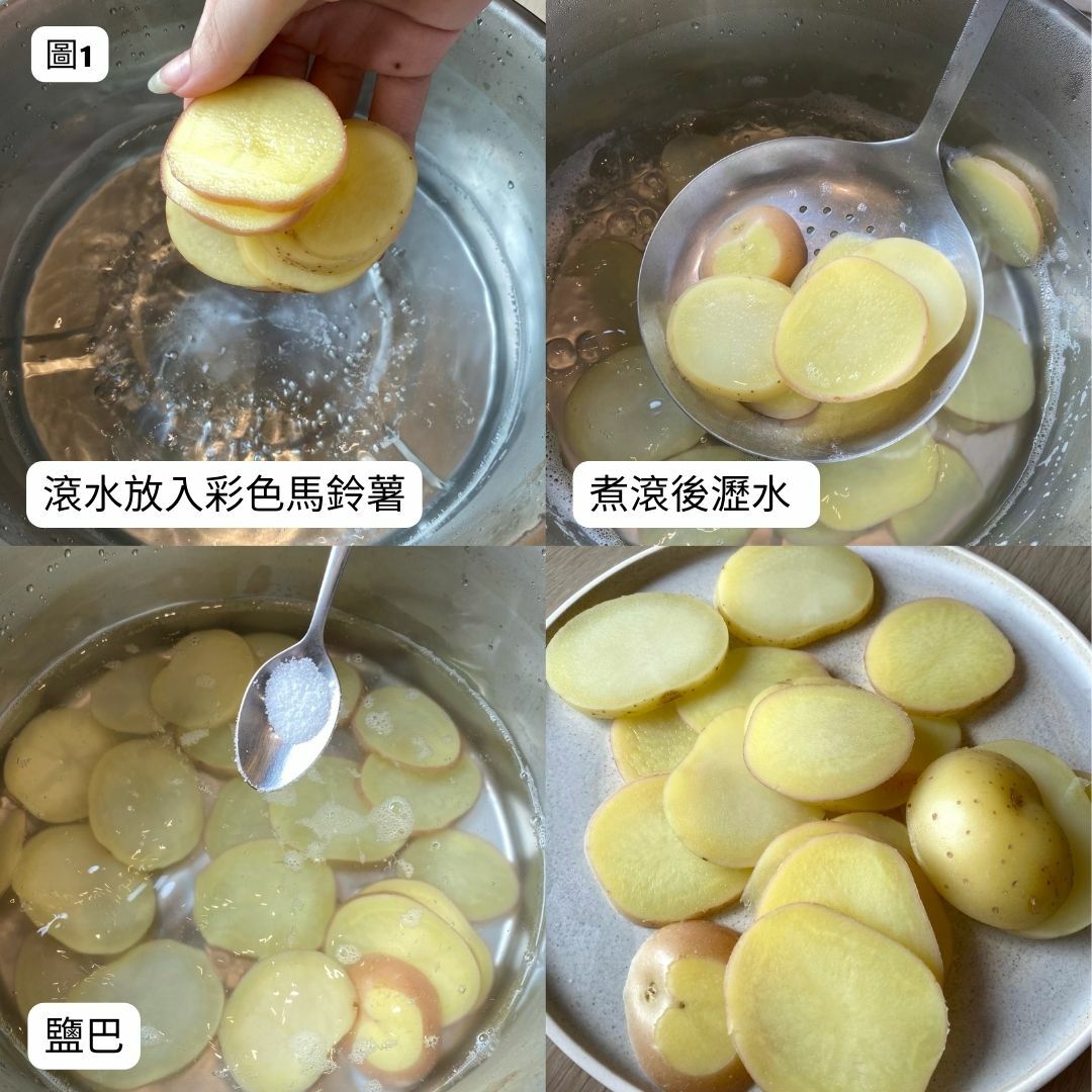圖1. 煮一鍋滾水,放入切薄片彩色馬鈴薯,加點鹽巴調味,煮滾後瀝水。