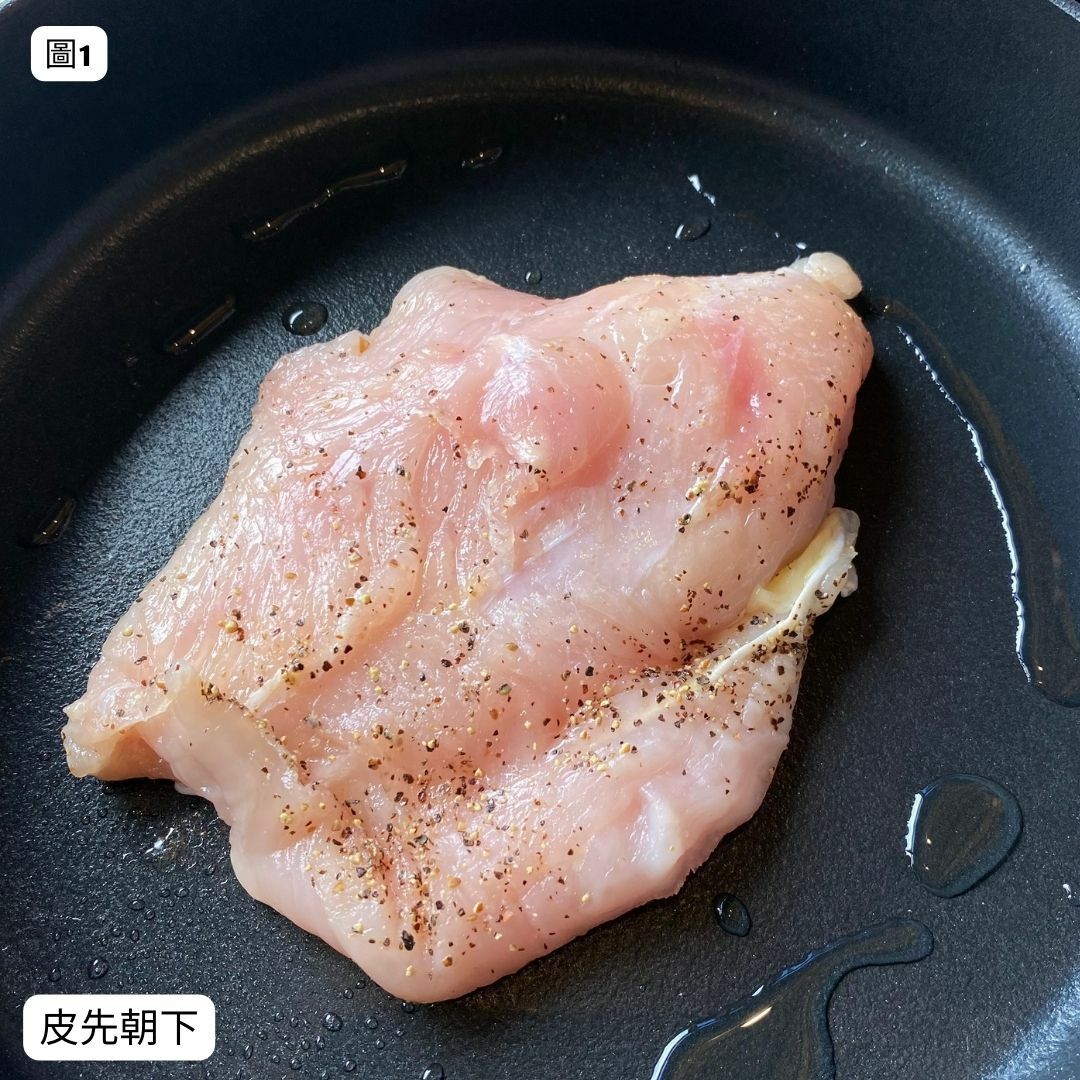 圖1、圖2. 1大匙橄欖油,熱油鍋,將竹地雞胸肉皮面朝下先煎約3鐘,可用肉眼看是否呈金黃色,再翻肉面煎。