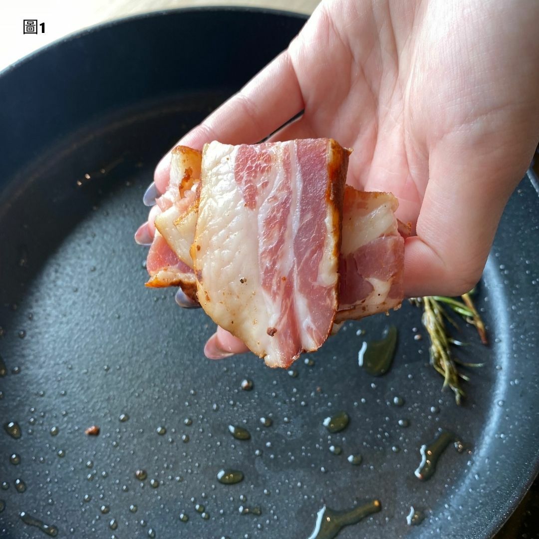 圖1. 利用剛剛煎雞胸肉的油,繼續煎煙燻培根。