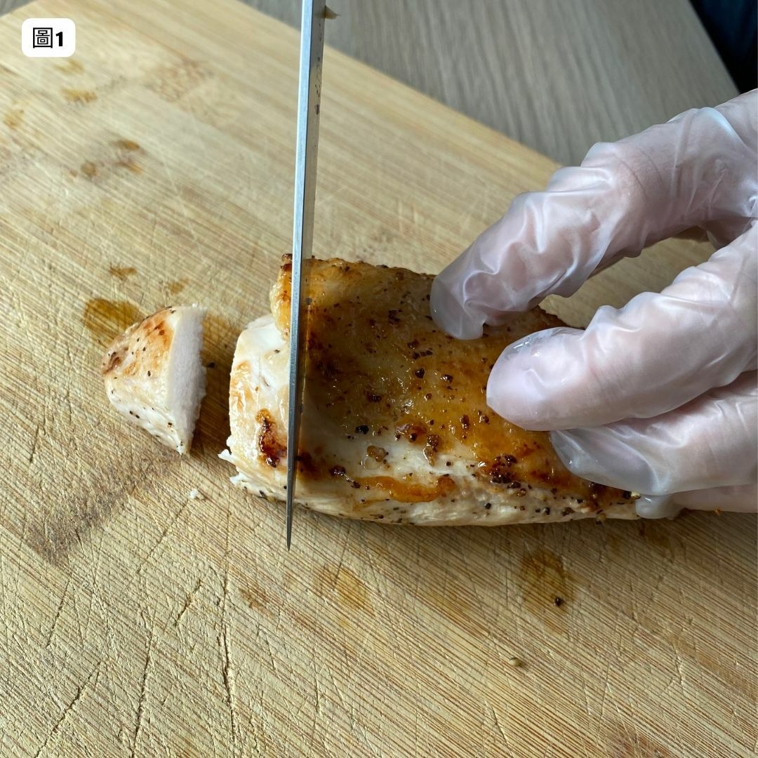 圖1. 將煎好的竹地雞胸肉分切,可以依照個人喜好切大小。