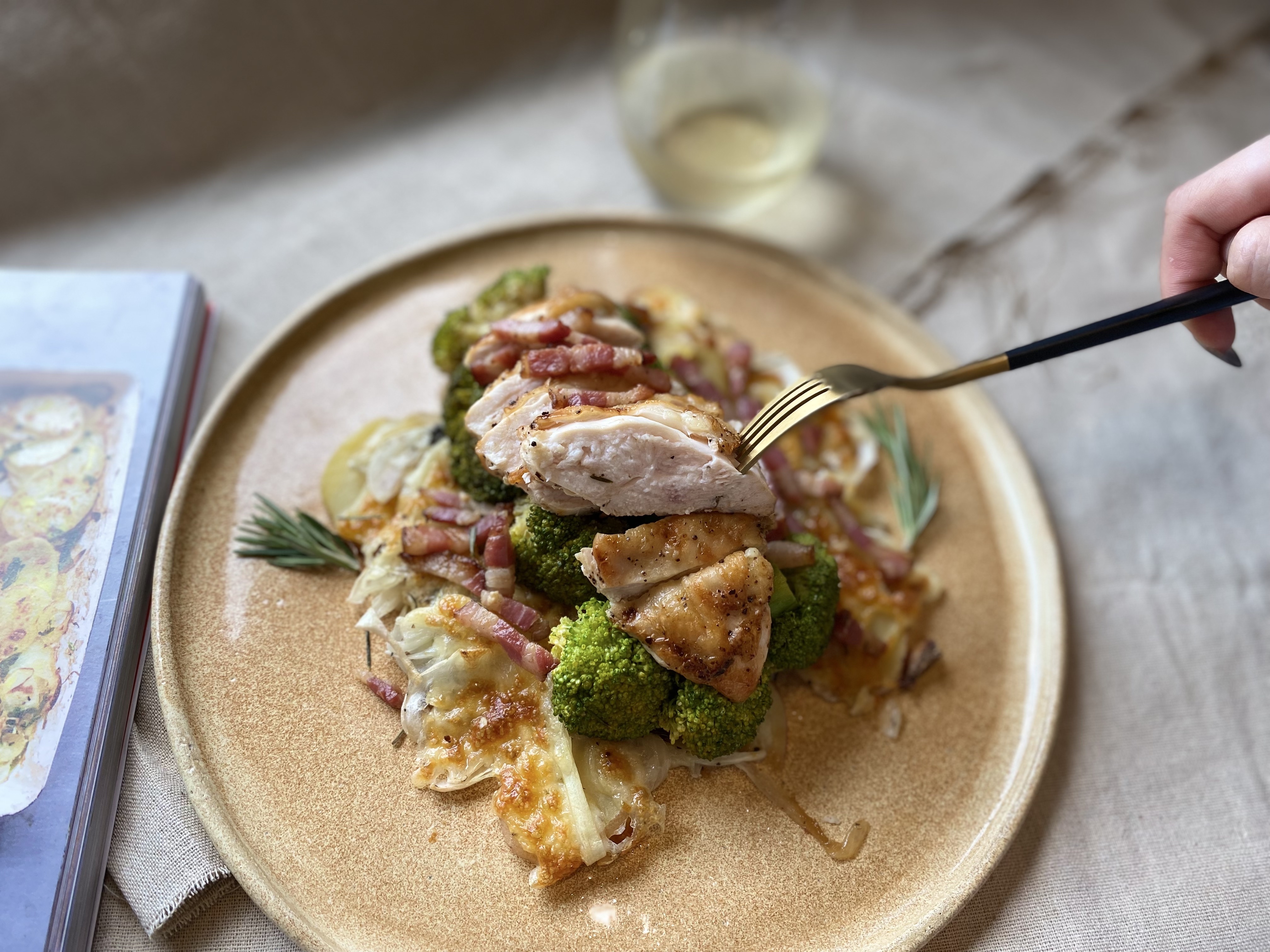 近年來,大家開始會吃舒肥雞胸肉減脂、減重,補充蛋白質,食材策展人採用不同烹調手法讓雞胸肉更有風味,選用新竹的竹地雞胸肉,外表煎得金黃脆脆的,肉裡面依舊多汁軟嫩,一口咬下去滿滿的鮮甜味和迷迭香綻放濃郁的清新味,吃肉也要吃蔬菜,搭配的綠色蔬菜可以幫助身體增加維生素和焗烤馬鈴薯補充些碳水化合物,吃得健康也吃得開心又有儀式感,很適合居家時,想隨意下廚的料理~