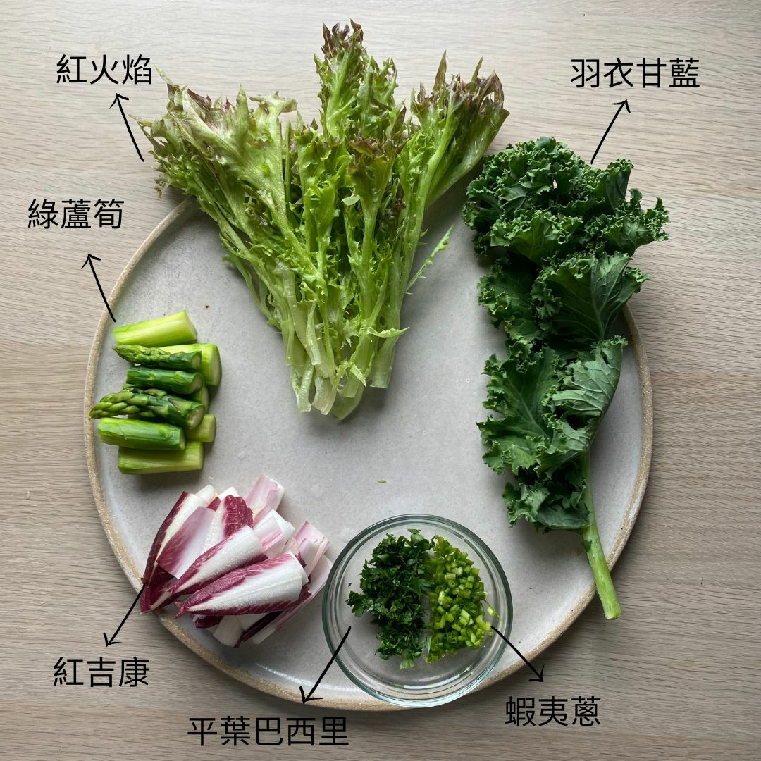 PARTS 竹地雞胸肉、綜合蔬菜包、紅吉康、羽衣甘藍、奶油乳酪、蝦夷蔥、平葉巴西里