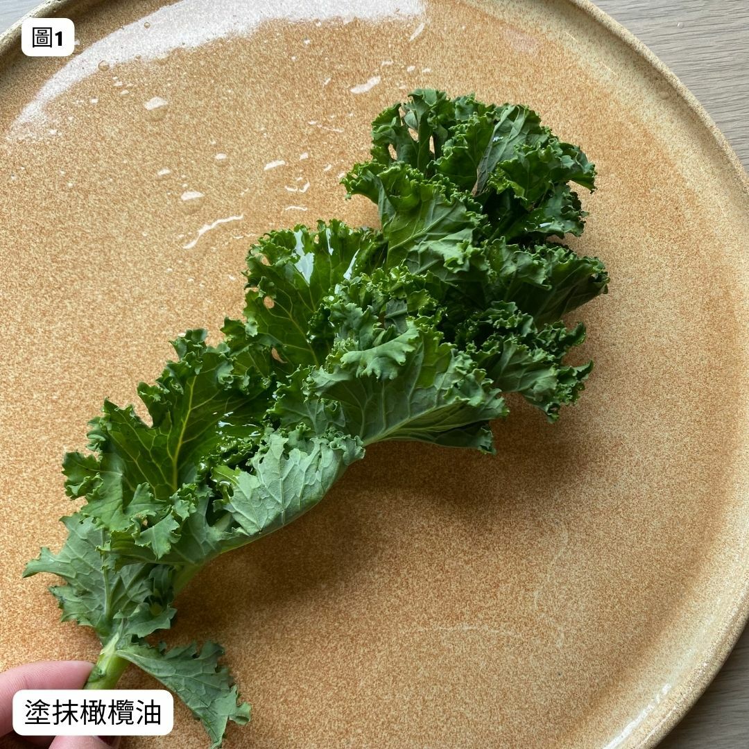 圖1. 將羽衣甘藍洗淨,利用廚房紙巾擦拭乾,塗抹薄薄一層橄懶油。