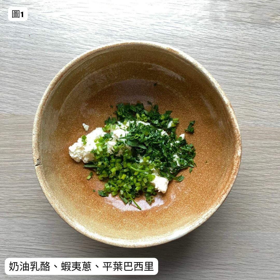 圖1. 準備一個碗,將奶油乳酪、蝦夷蔥、平葉巴西里放一起。