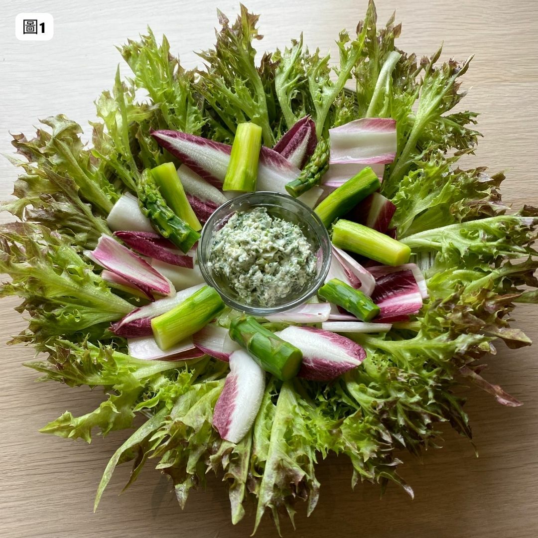 圖1. 選一個淺盤,鋪上紅火焰和其他蔬菜呈一圈一圈樣,中間放上奶油乳酪醬。