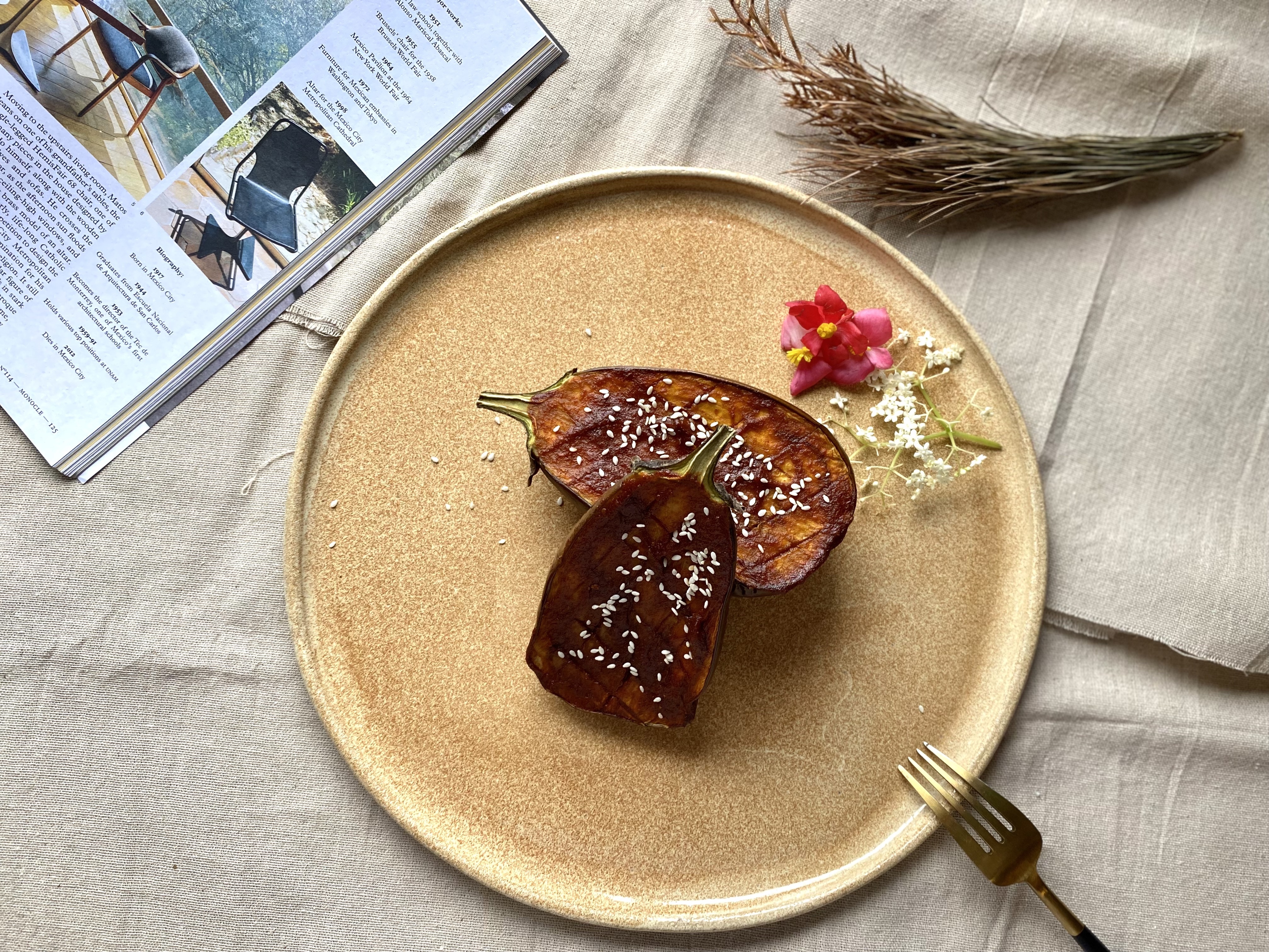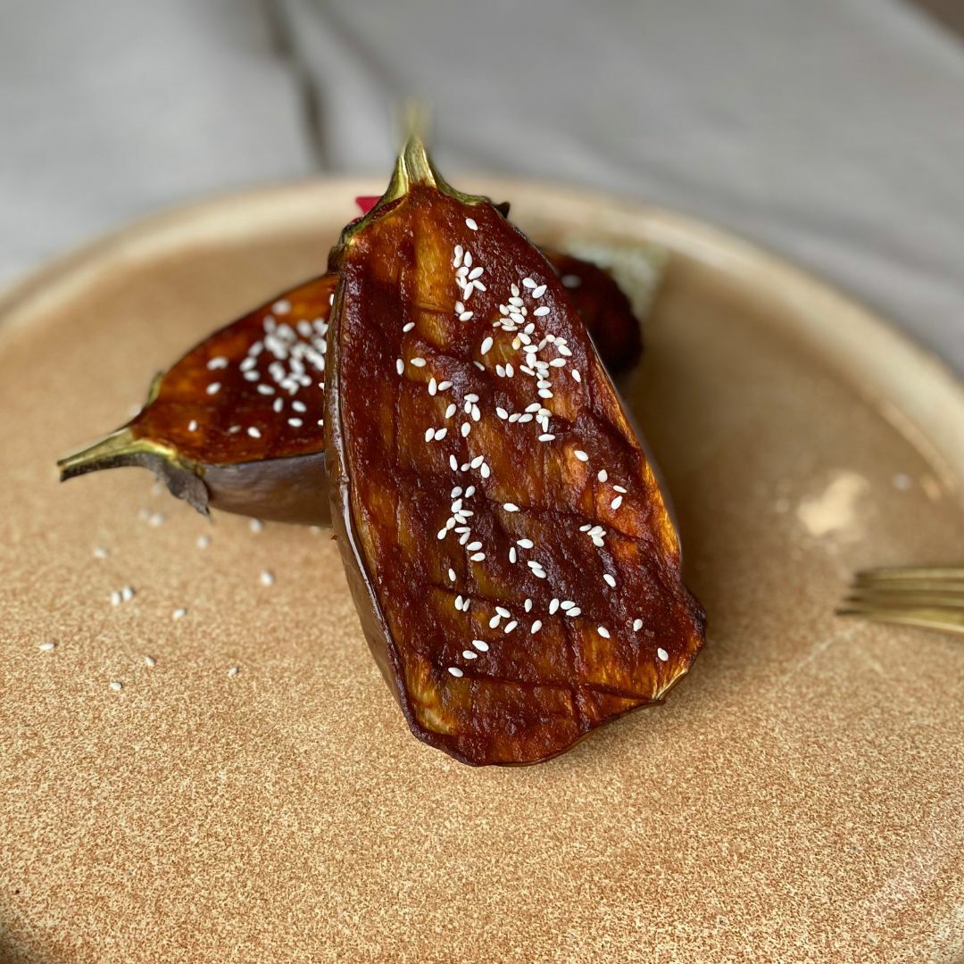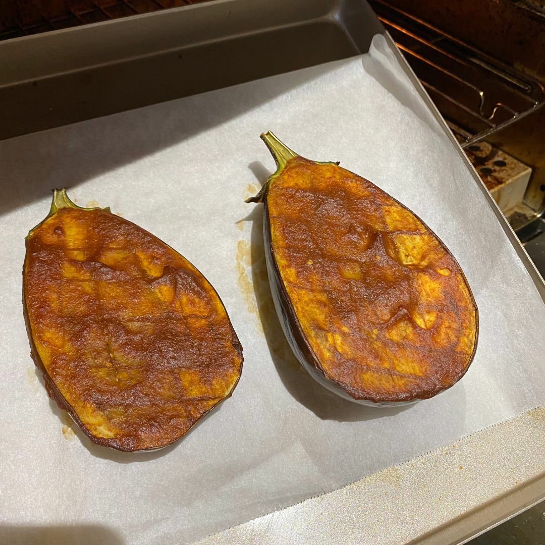 烤完5分鐘後,取出以烤好的日本烤味噌圓茄。
