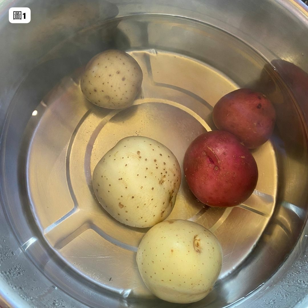 圖1. 準備一鍋加鹽的滾水,煮熟透彩色馬鈴薯。