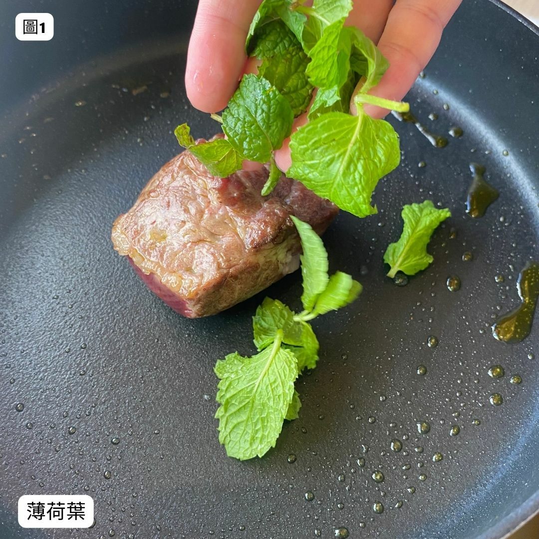 1大匙芥子油,熱油鍋,羊里肌放進去加入些許薄荷葉、2大匙蘋果汁、些許麵粉調味,是讓羊里肌有著芥末清爽的香氣。