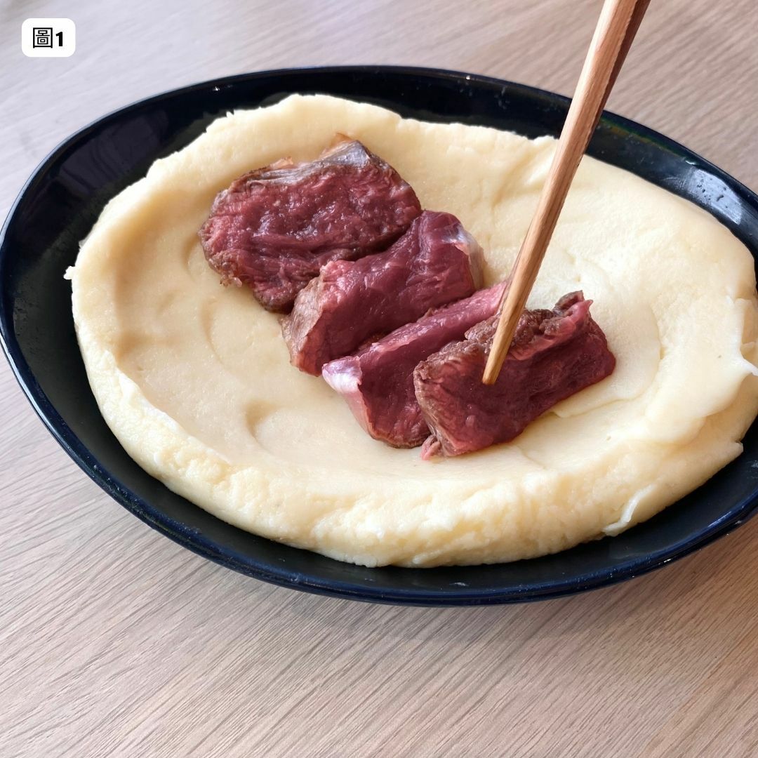 圖1. 選一個淺盤,將馬鈴薯鋪上,再鋪上羊里肌。
