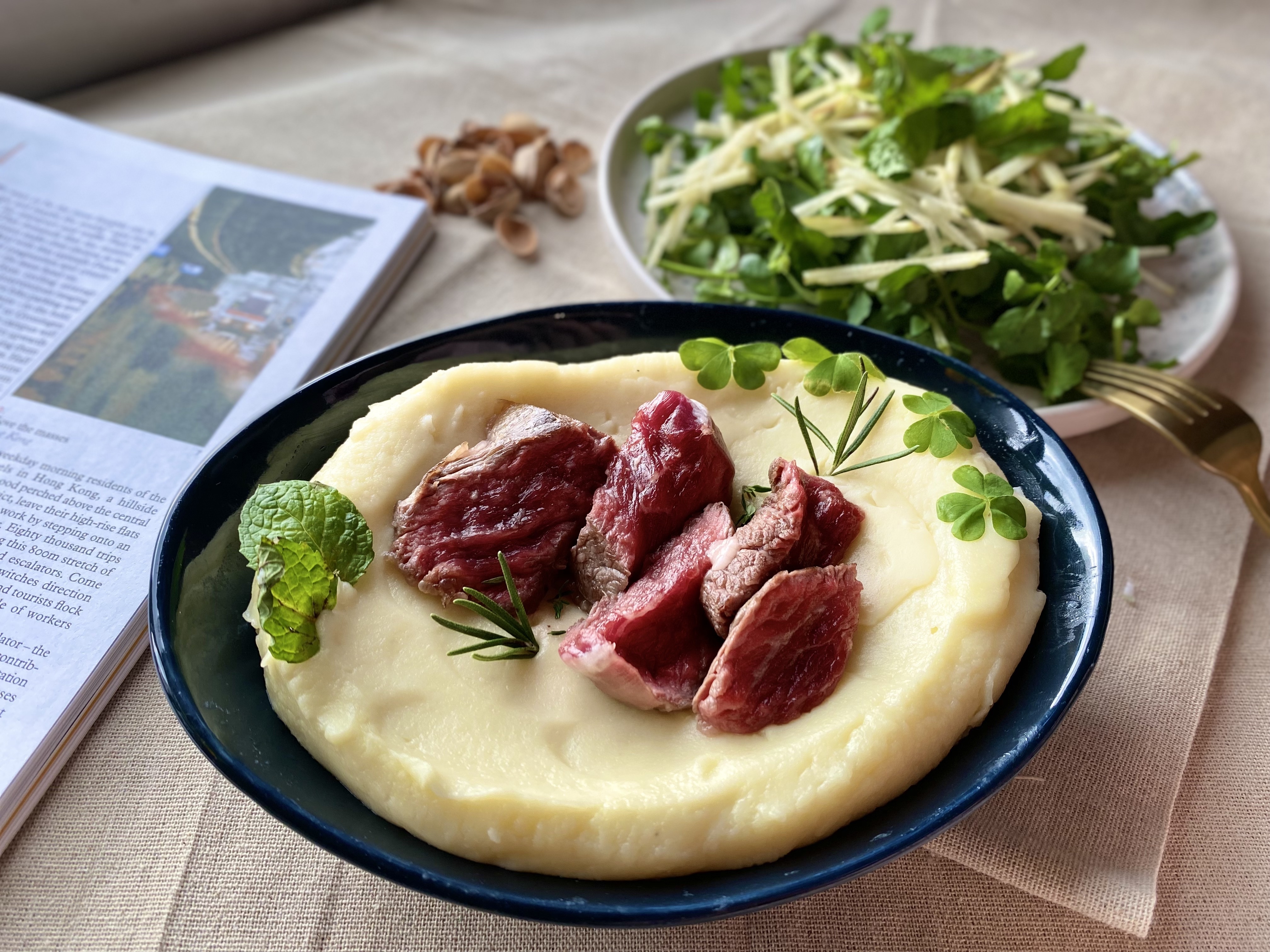 綿密鬆軟的馬鈴薯泥像是一層層天上的雲朵包覆著羊里肌鮮嫩的肉質,搭配著酸甜的沙拉,口感層次就像喝調酒般,一層一層的韻味~想像是在一望無際的大草原上,呼吸著大自然氣息,口感完全一點都不油膩!