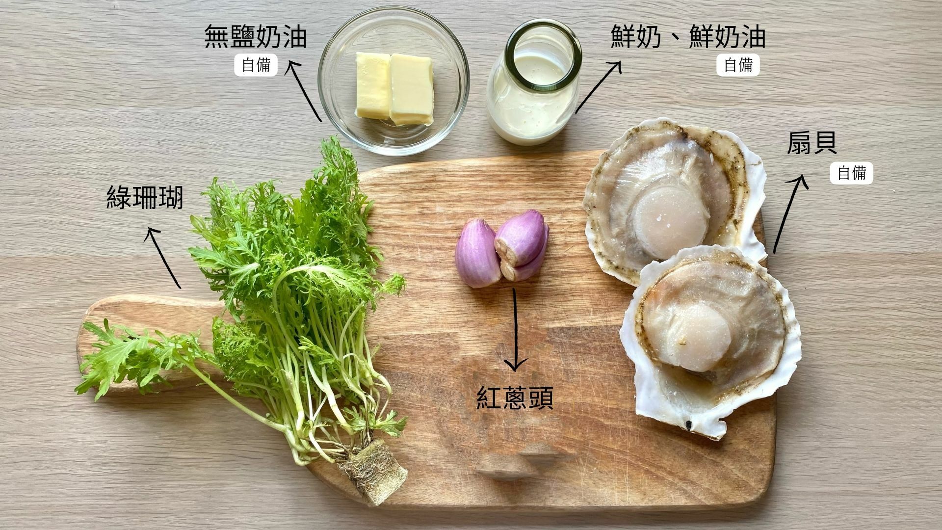 自備 扇貝、無鹽奶油、鮮奶油、牛奶、荳蔻粉