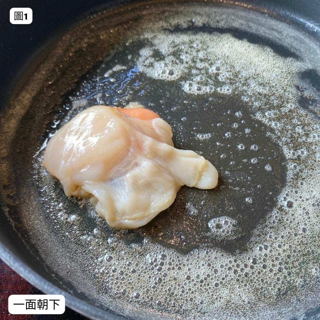 圖1、圖2. 熱鍋,15g無鹽奶油至融化後,放入扇貝,第一面朝下煎至金黃色澤。