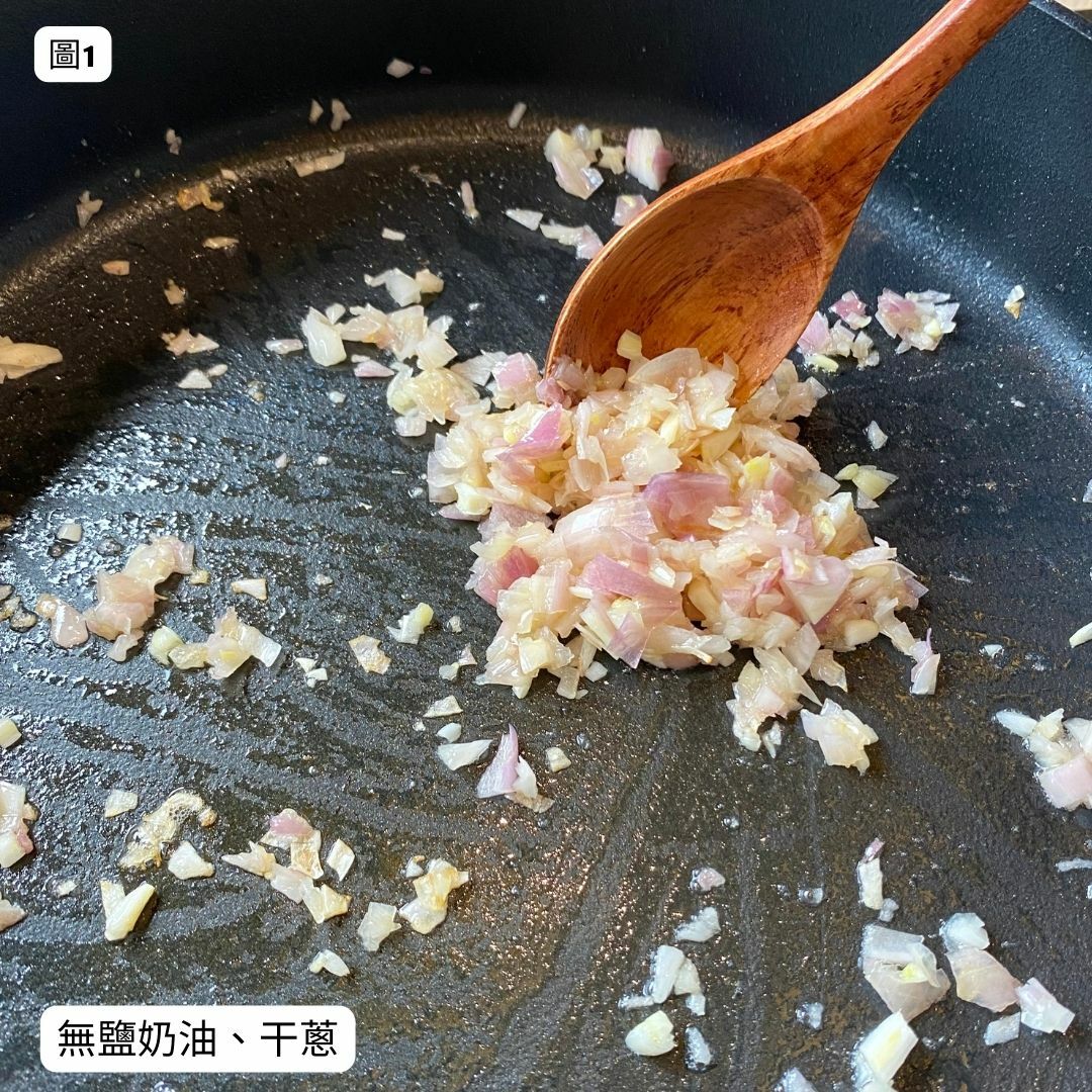 圖1. 熱鍋,15g無鹽奶油至融化,加入紅蔥頭末,炒出香氣。