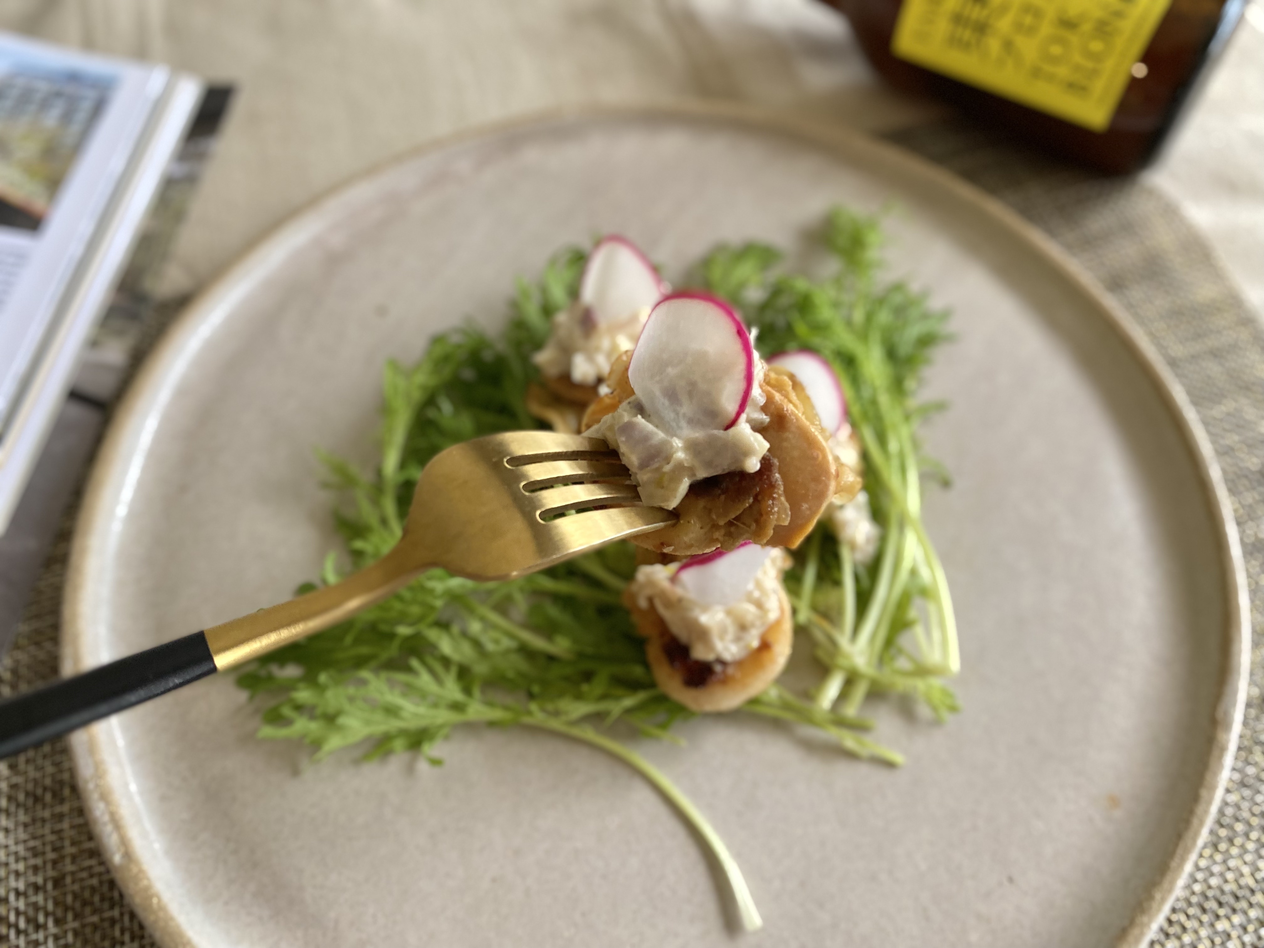 奶油煎香扇貝嚐起來非常香甜,搭配的紅蔥頭在奶油醬裡完全解膩,也帶出鹹甜的香味,再搭配綠珊瑚,帶有芥末辛辣口感,整道料理是有層次感的,很適合做一道前菜,也適合一人為自己下廚享受自己的美好時光!