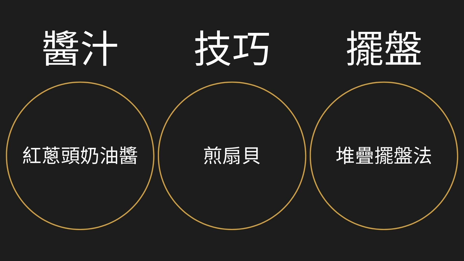 選一個淺盤,利用「堆疊」呈現脆煎干貝佐紅蔥頭奶油醬。