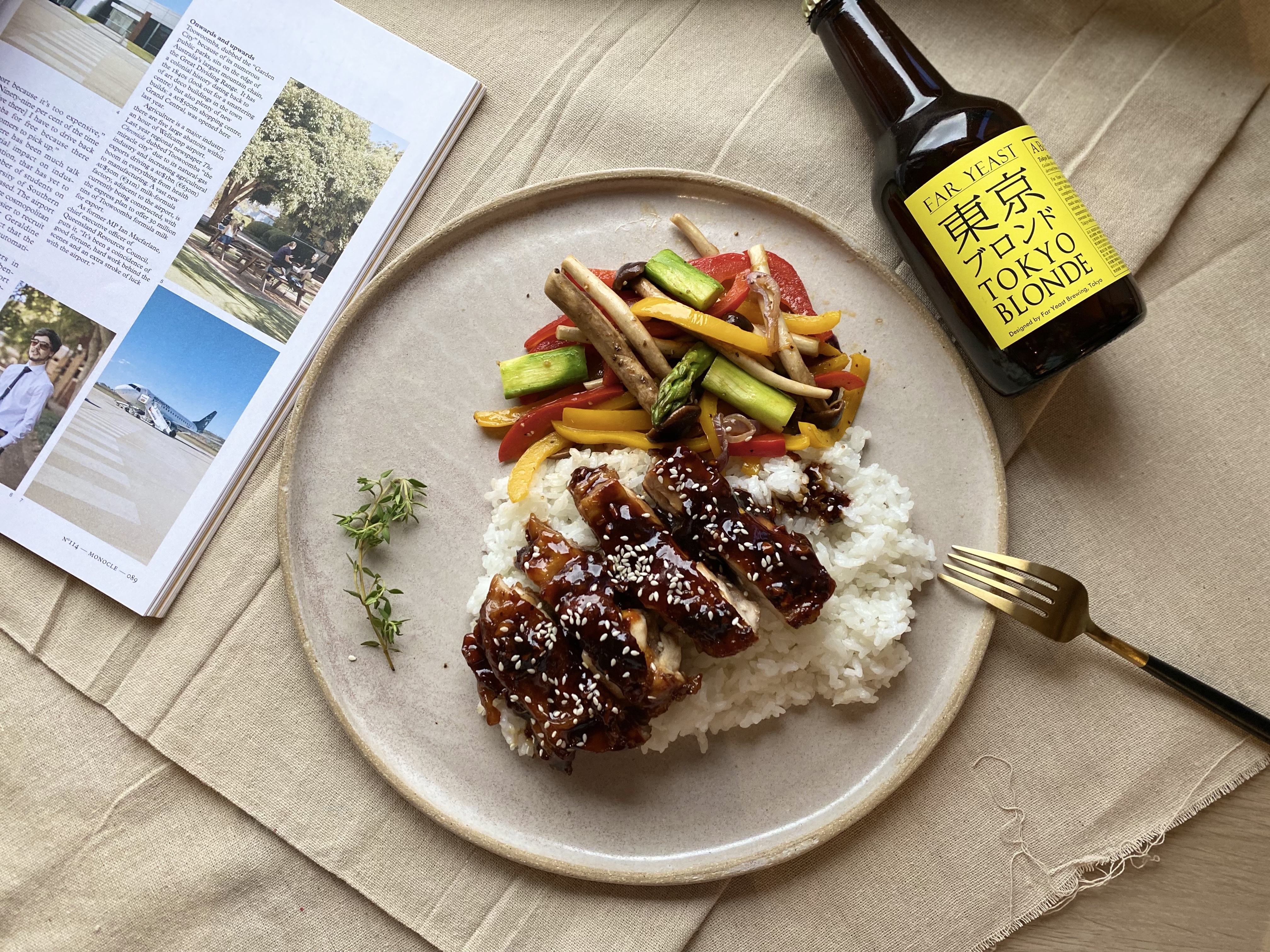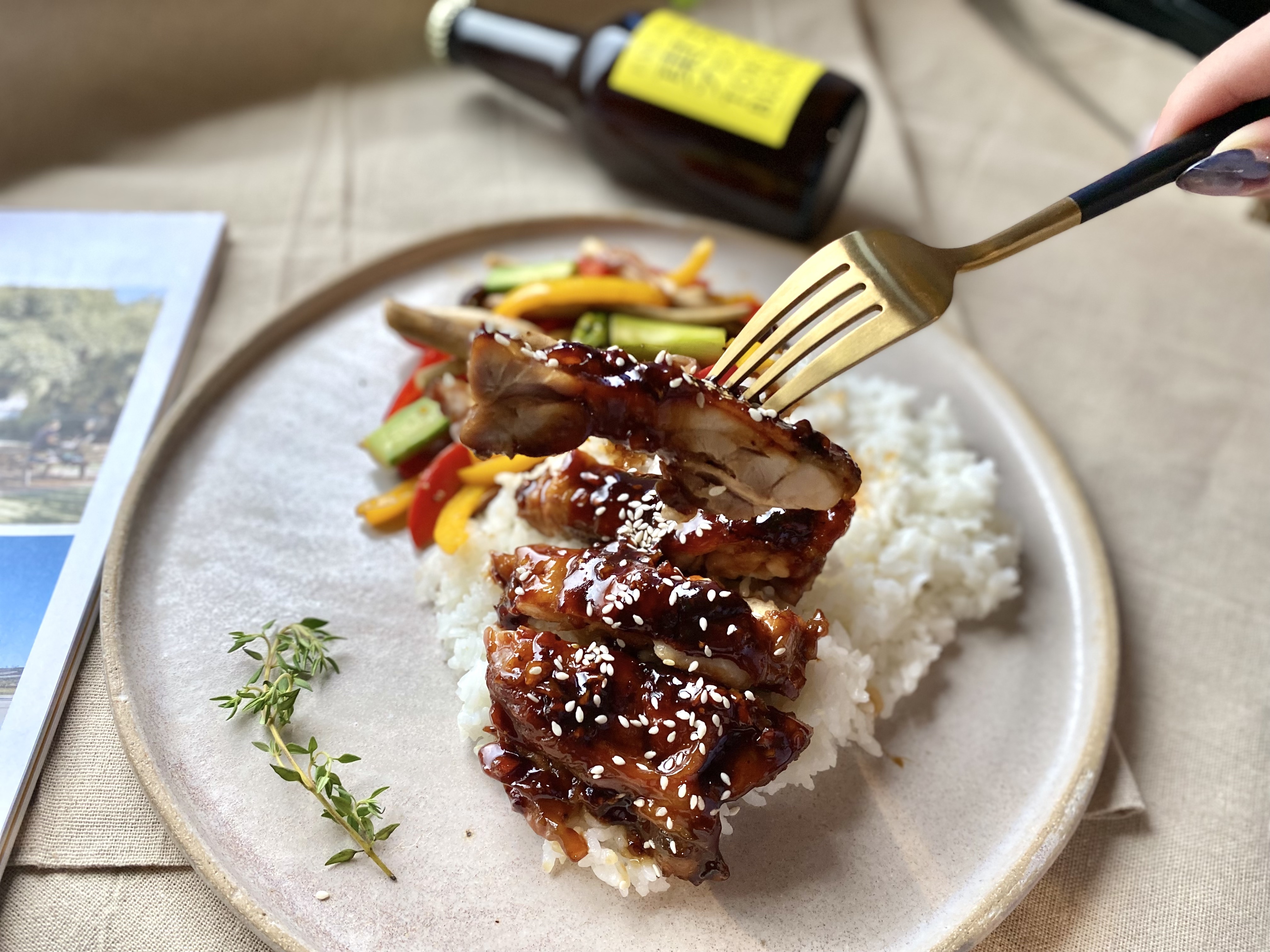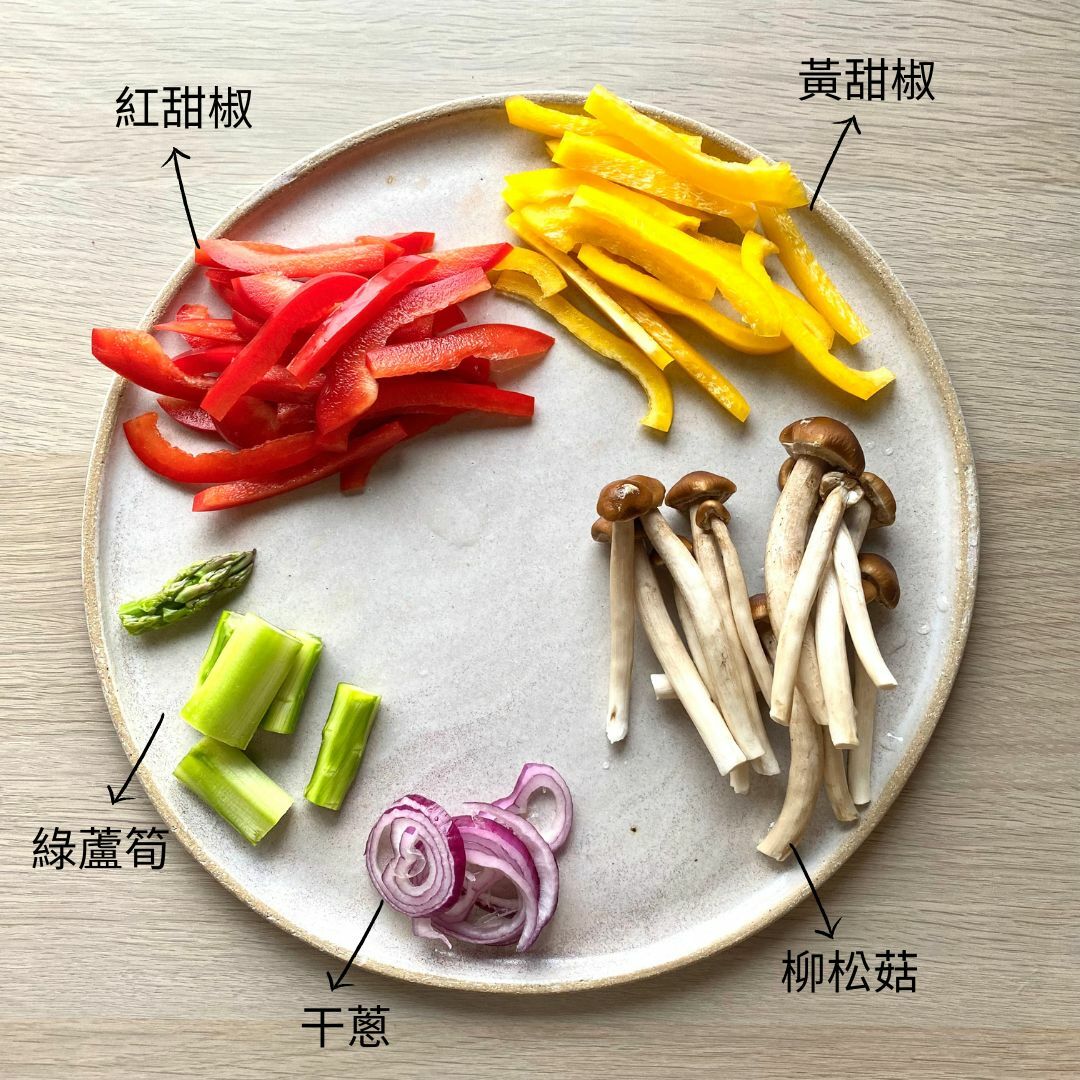 再熟悉不過的照燒醬,鹹甜鹹甜,搭上竹地雞腿肉,更凸顯了竹地雞腿飽滿多汁,肉質很細又鮮甜,裹上照燒醬,醬油的香氣、甜醇口味,讓人意猶未盡,有肉也要有配菜,紅、黃甜椒、綠蘆筍有豐富的維生素A、B、C,柳松菇富含礦物質、高纖維,這道料理,既豐富又營養~