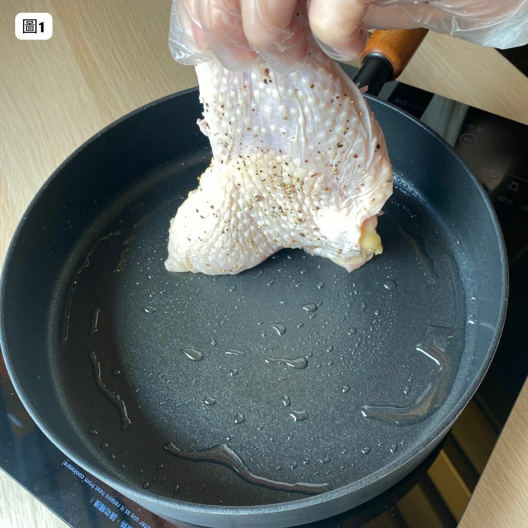 圖1. 1湯匙橄欖油加入鍋子,熱油鍋,將去骨竹地雞腿肉皮面朝下。