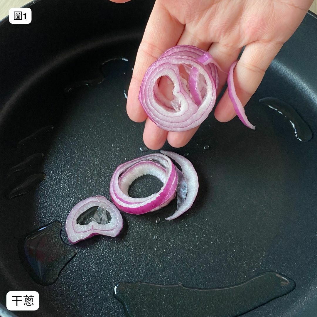 圖1. 1湯匙橄欖油,熱油鍋,將干蔥先爆香。
