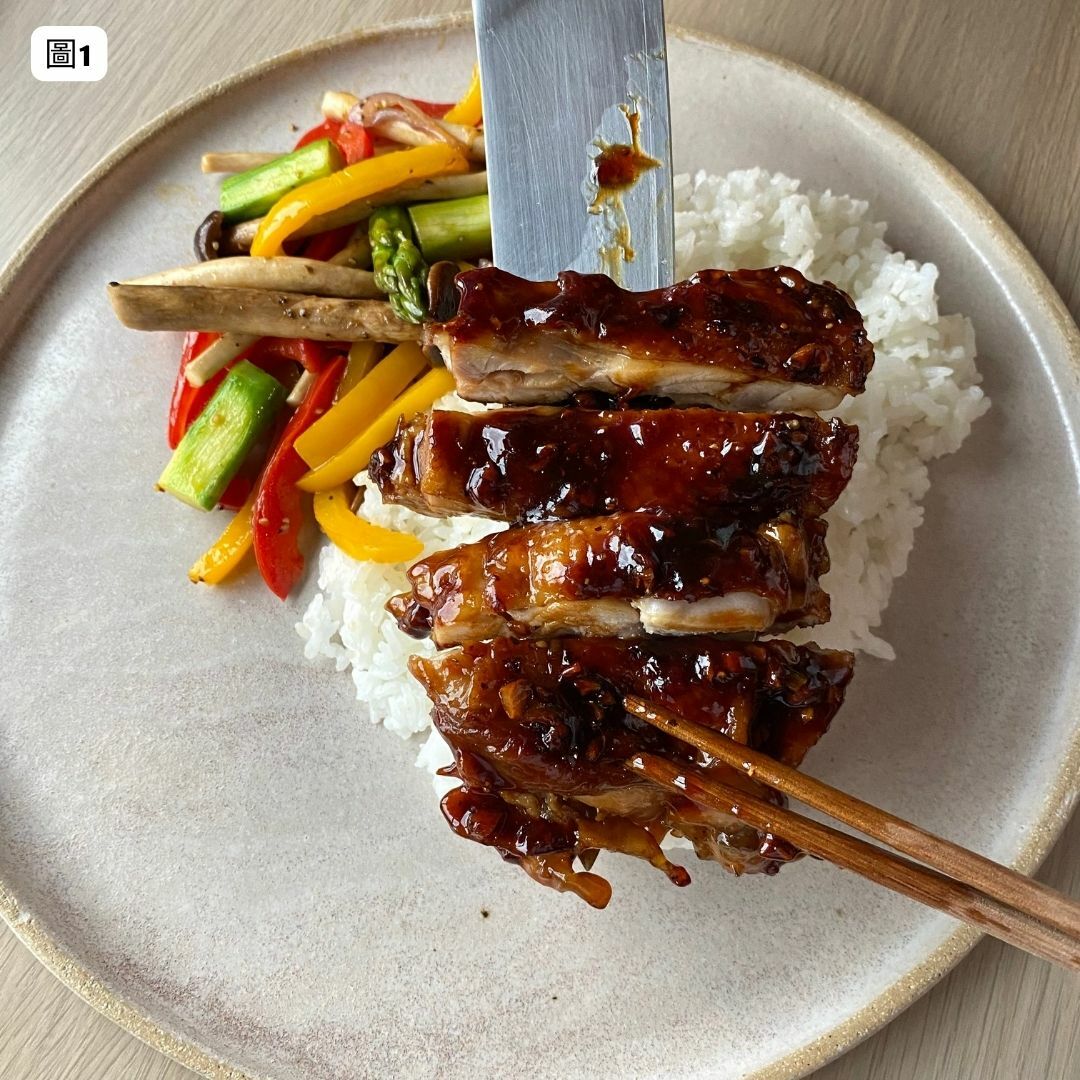 圖1. 選一個淺盤,米飯鋪下層,鋪上照燒竹地雞腿肉,旁邊放上黃綠紅蔬菜&柳松菇。