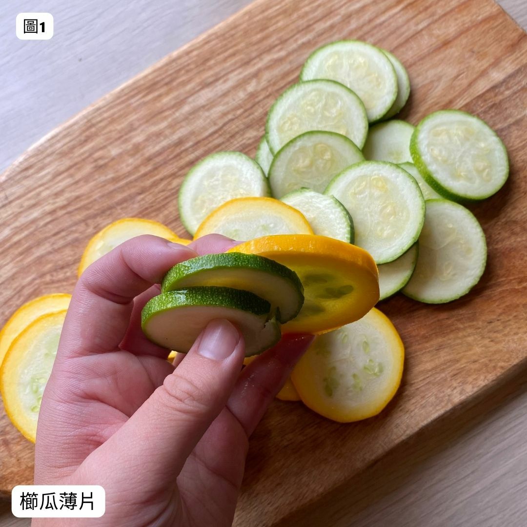 圖3. 烤盤上,鋪一張烘焙紙,將櫛瓜薄片顏色交錯放排整齊。