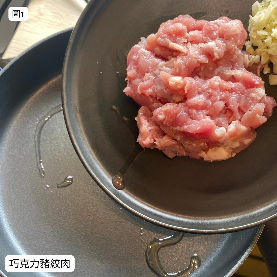 圖1. 1大匙橄欖油,熱油鍋,先將巧克力豬絞肉炒香上色。