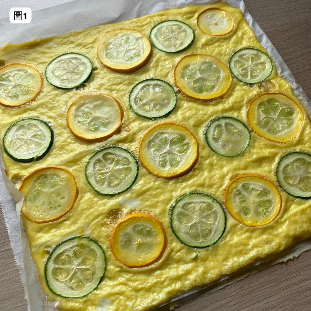 圖5. 將蛋液淋上有櫛瓜的烤盤裡,均勻鋪蓋。烤箱預熱上、下火200度,烤15分鐘。