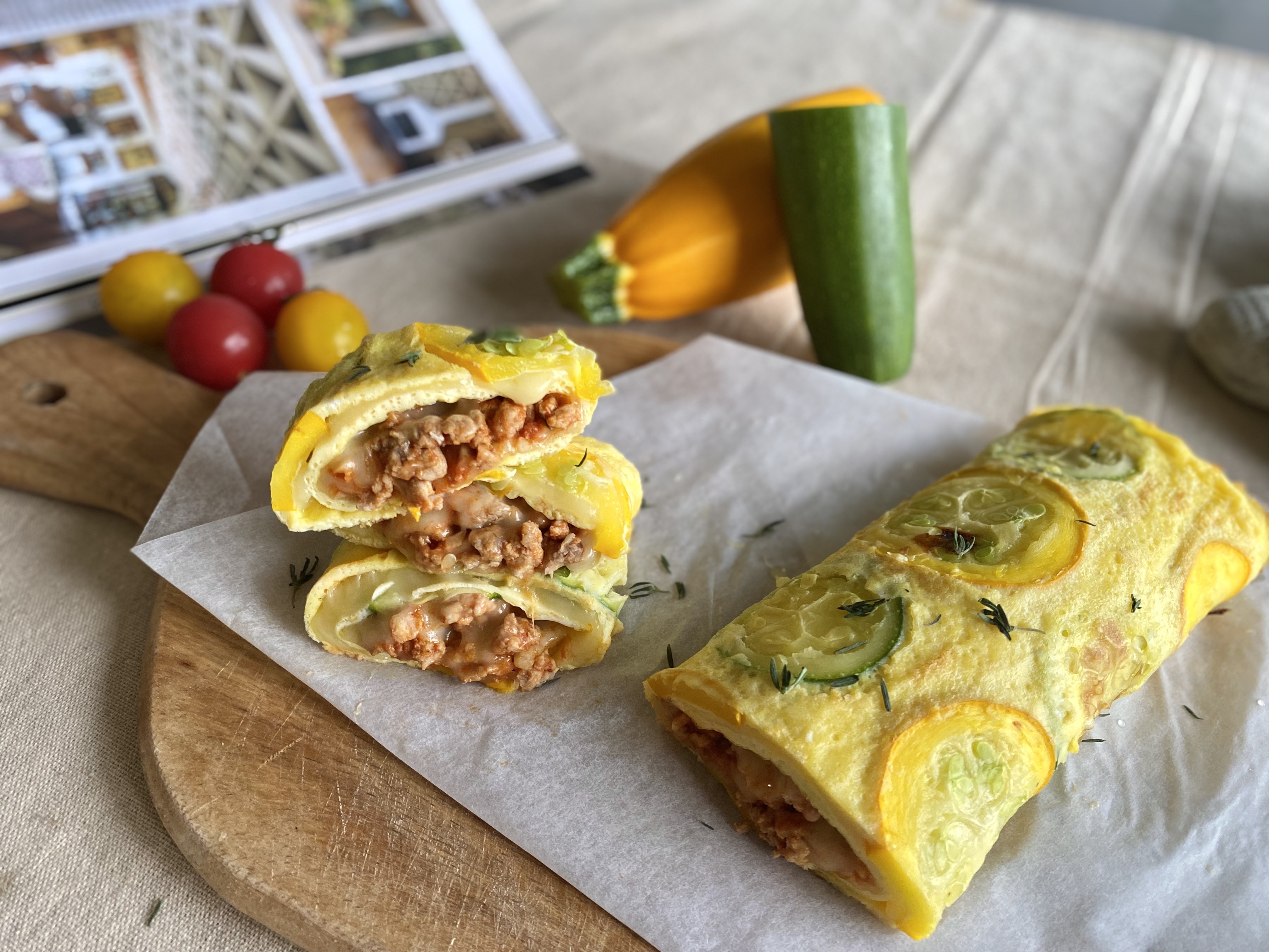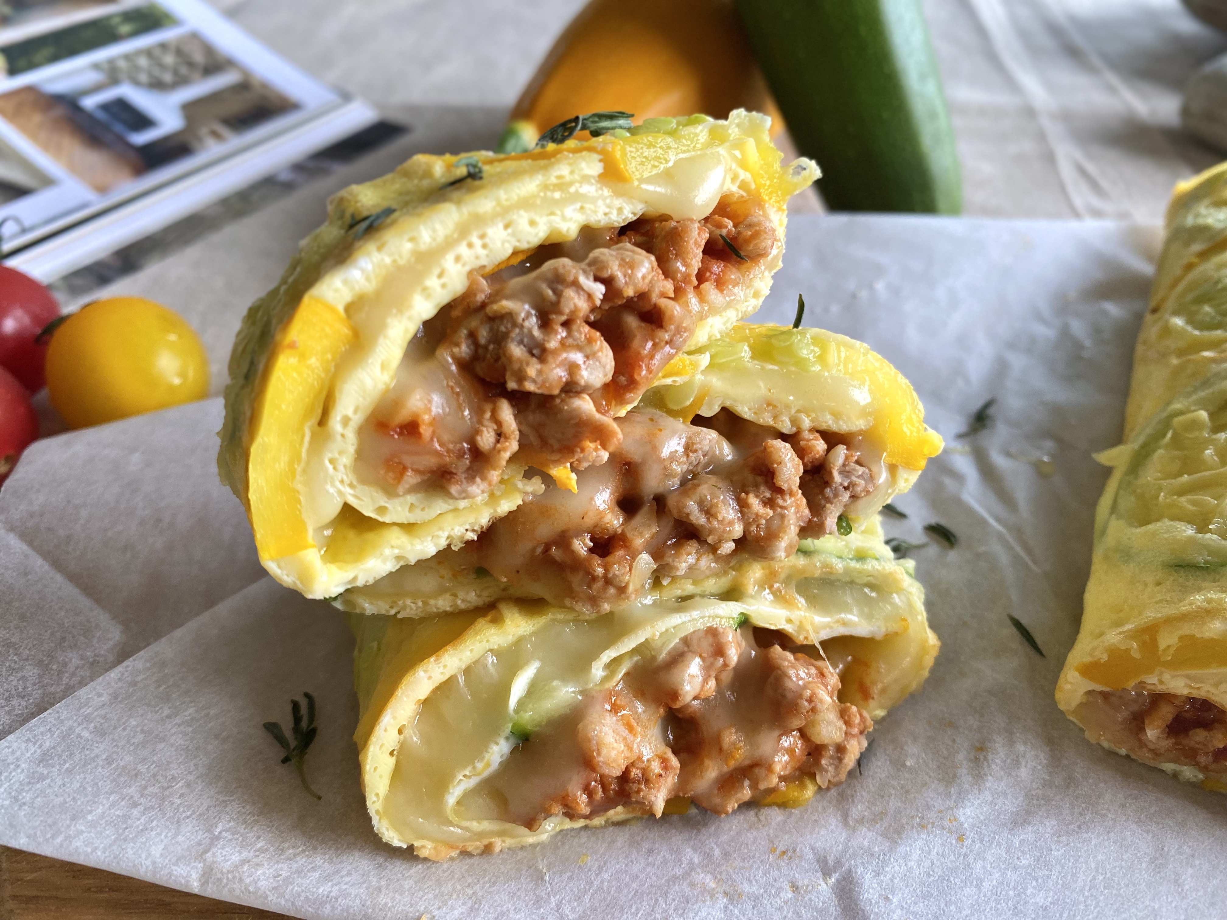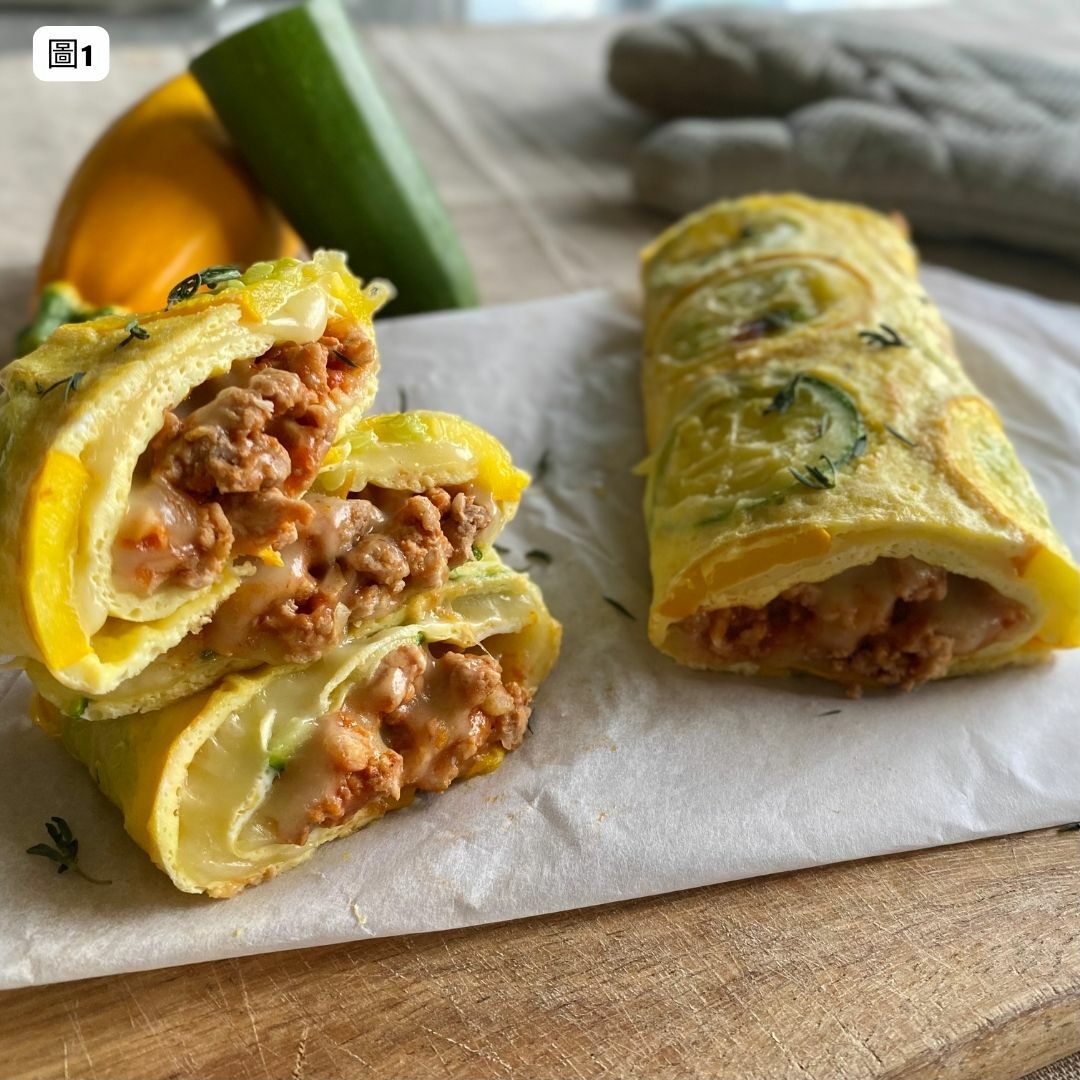 扎實軟嫩的櫛瓜蛋捲皮,帶有著櫛瓜飽水度和蛋香,是一道有層次的料理,櫛瓜的水潤感、蛋香、巧克力豬絞肉的油質鮮甜不膩,還有滿滿的乳酪絲,真的很療癒!好適合慵懶的週末,做這道有蔬菜有肉,非常有飽足感的早午餐~
