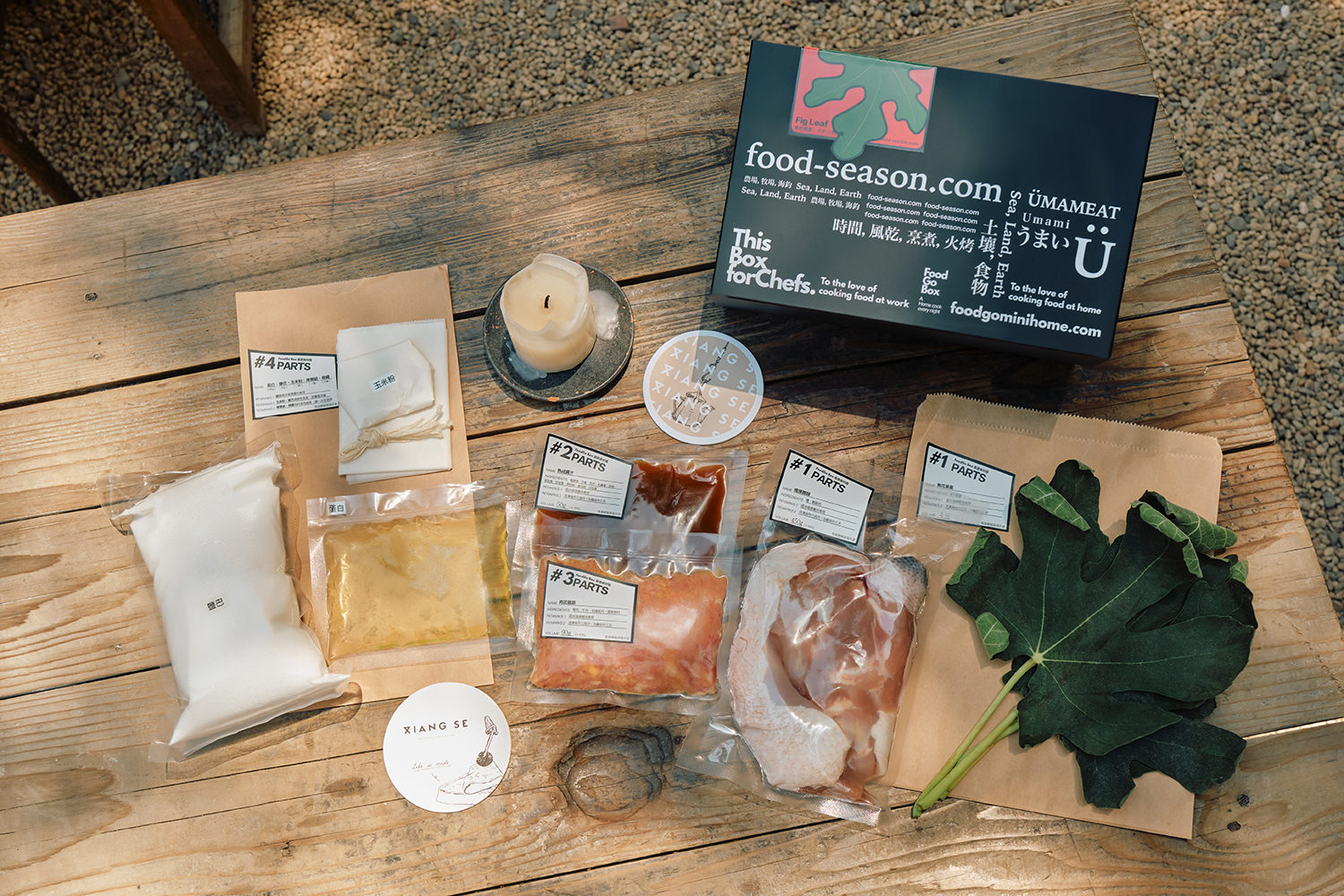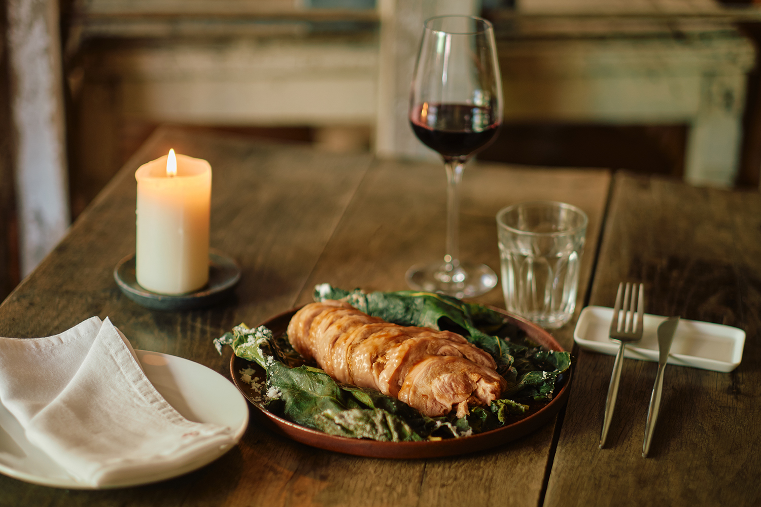 使用來自高雄杉林區,用中藥飼養在山野間16週的大野山雞雞腿,鹽滷後用龍眼木煙燻,中間捲入摩洛哥風味肉泥慕斯,再用無花果葉包裹雞腿捲去鹽焗,讓雞肉增加無花果葉帶有椰子香氣的草本味,烤熟後搭配熟成鴨骨與蔬菜一同熬製的肉汁一同享用!