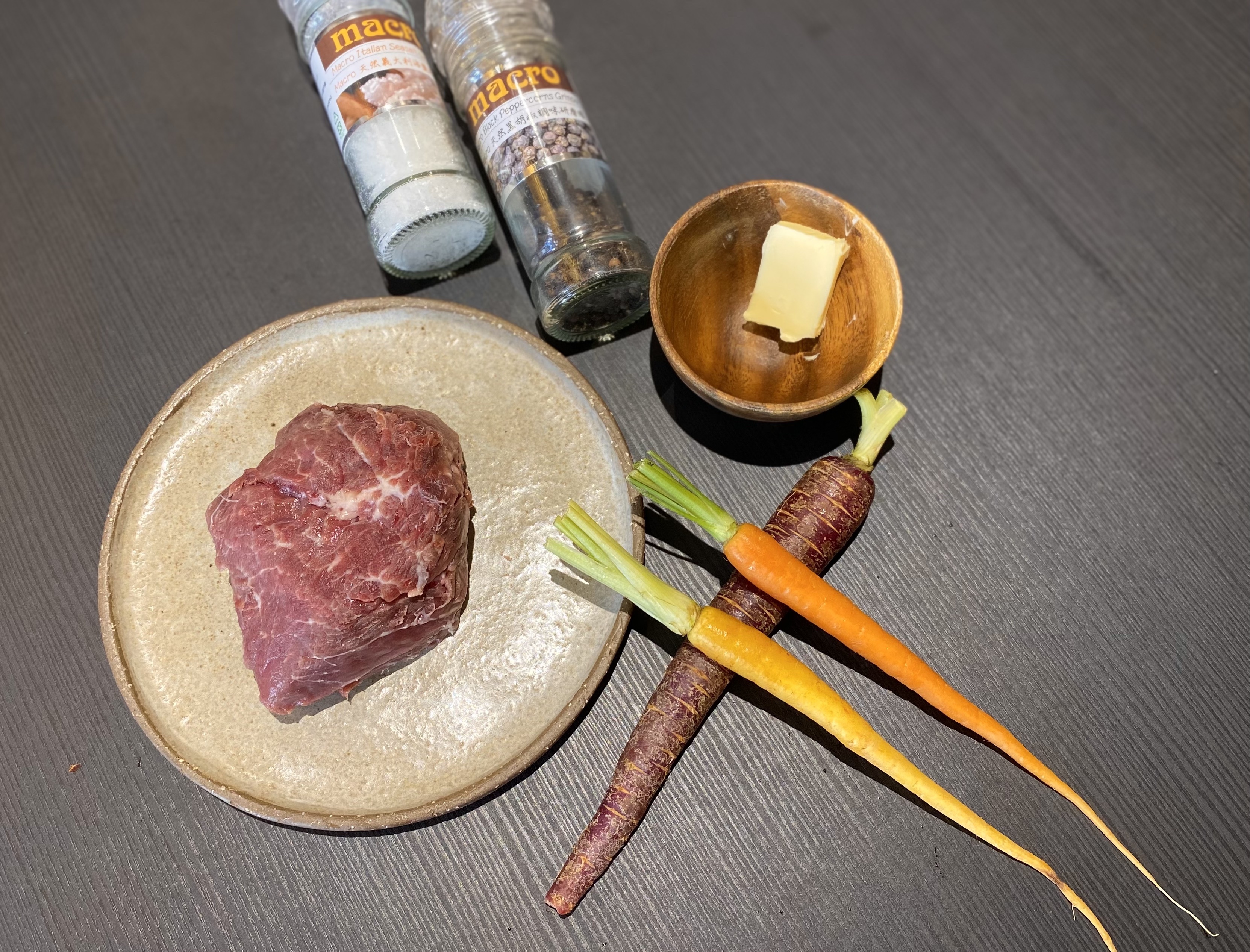 將 #1 手指蘿蔔 洗淨削皮後、#2 菲力牛排 ,採用 #3 無鹽奶油煎至金黃色調味,即可上桌!