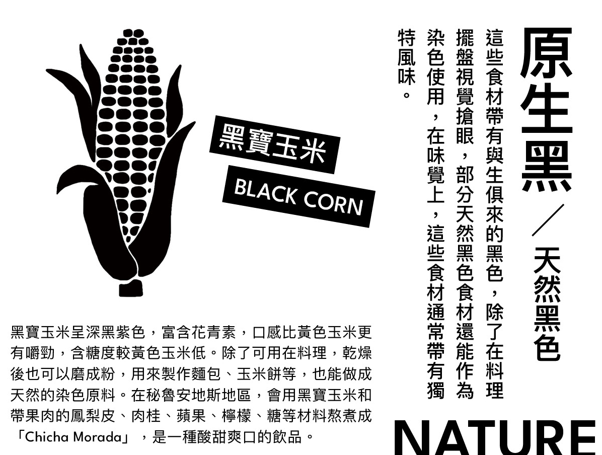 黑寶玉米呈深黑紫色,富含花青素,口感比黃色玉米更有嚼勁,含糖度較黃色玉米低。