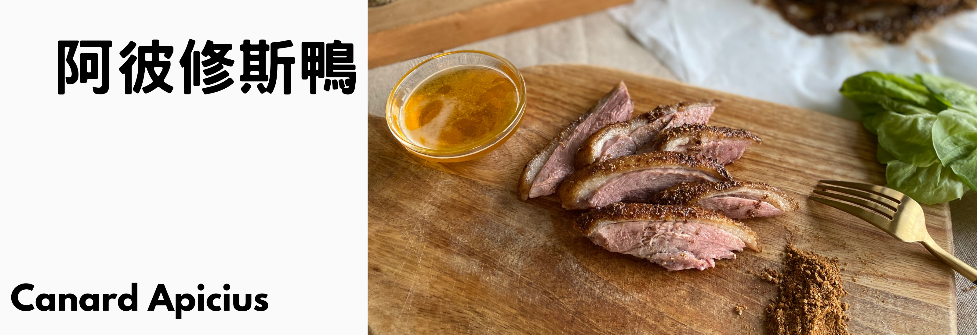 這不是另一種鴨的品種,而是更能呈現胭脂鴨特色的料理手法。源自法國廚神復刻源古羅馬烹飪大師Apicius的失傳食譜,被視為早期最豐富詳細的著作「烹飪論」,主要食材是蜂蜜與香料混合的醃料,塗抹在胭脂鴨的皮面上、再進行烹煮,比起一般搭配濃厚醬汁的作法,阿彼修斯式的版本,更輕盈,且因為加入更多新鮮香草,口中的餘味會延續更久。