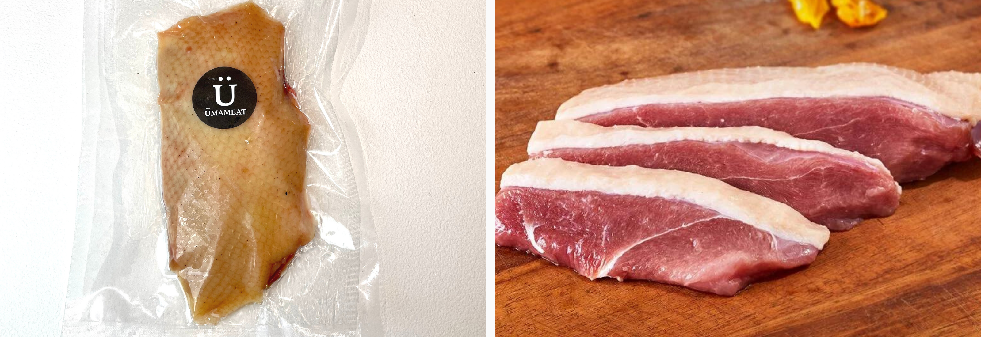 食材策展人團隊考究了法國經典名菜血鴨(canard étouffé)的風味特色,特別開發出台灣在地生產且適合西餐使用的獨家商品「胭脂鴨」。從品種到分切就開始挑惕,最後再以職人的乾式熟成法,熟成240個小時,讓肉質達到極致軟嫩與甜度滋味的高峰,風味更勝頂級牛排。