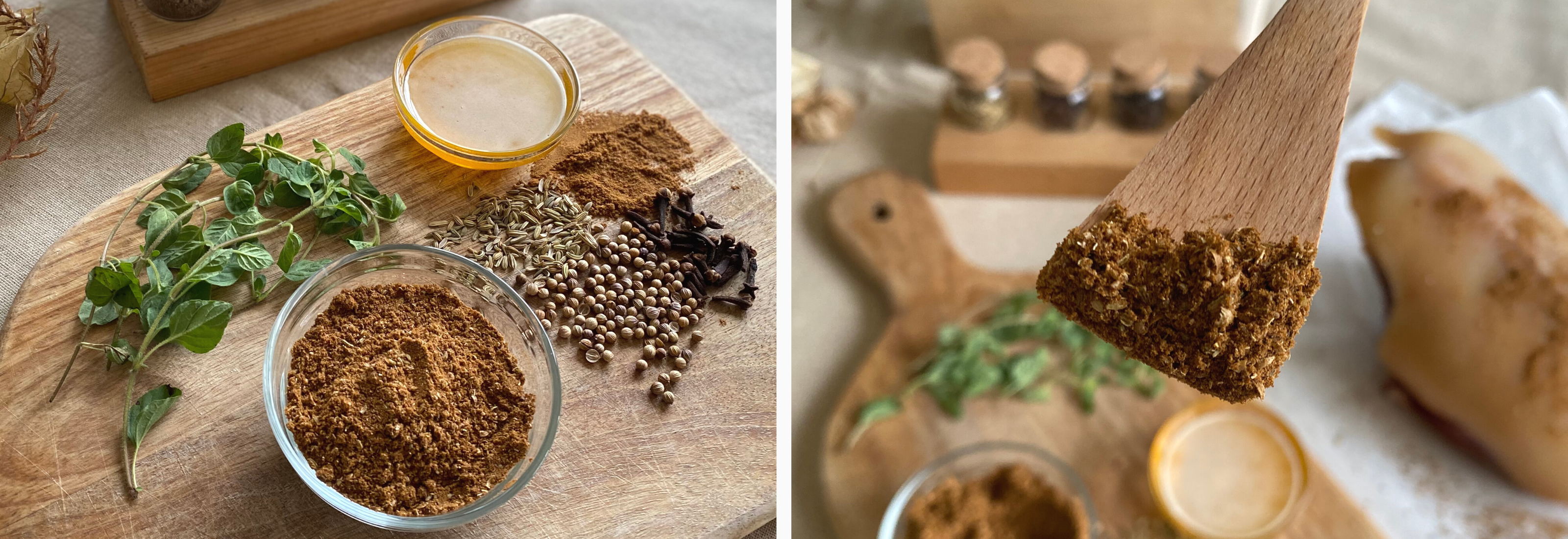 皮面塗抹混合的蜂蜜、新鮮奧勒岡,再均勻撒上綜合香料粉。預熱烤箱上、下火180~200度,烤約15分鐘。