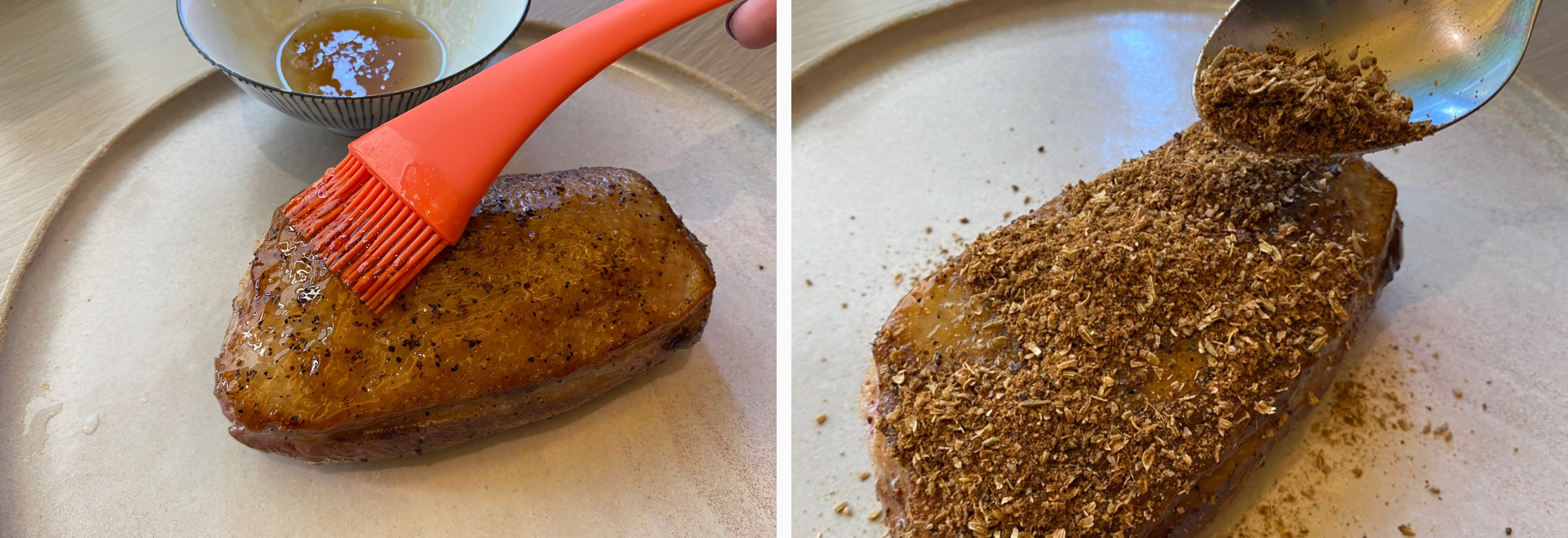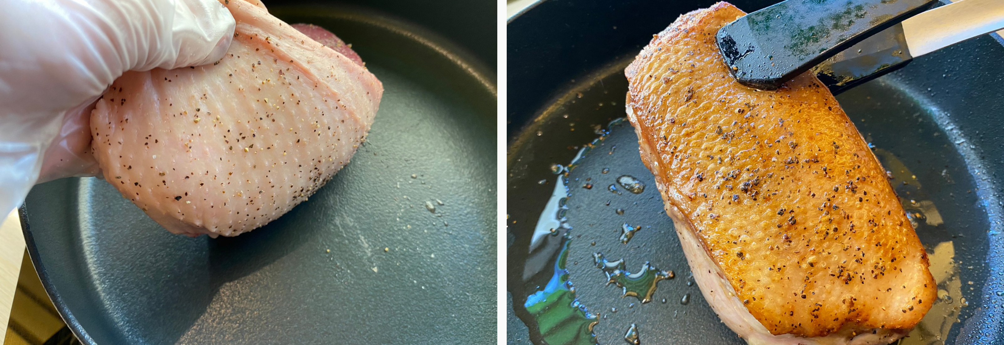 將胭脂鴨皮面朝下先煎5分鐘至金黃色,翻至肉面煎1分鐘,四角各煎15秒,靜置休息3分鐘。